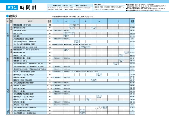 ※映像授業は対面授業以外の曜日でもご受講いただけます。月火木金土日18:50〜21:30川野18:20〜19:50宮下16:10〜17:40伊藤授業分数1509090/150※ご都合にあわせてご視聴ください18:20〜19:50市位19:40〜21:10百々19:40〜21:10笠井※ご都合にあわせてご視聴ください●難関国公立大英語●国公立大英語19:40〜21:10村瀬(宗)※ご都合にあわせてご視聴ください※ご都合にあわせてご視聴ください※ご都合にあわせてご視聴ください20:10〜21:40宮下●私大英語●入試頻出英文法・語法18:50〜21:30宮田18:50〜20:20三田村17:00〜18:30三田村17:00〜18:30加藤15:10〜16:40加藤●難関理系数学ⅢC●難関数学ⅠAⅡBC●標準理系数学ⅢC●標準数学ⅠAⅡBC90909090901509090909090909090909090/150※ご都合にあわせてご視聴ください9060※ご都合にあわせてご視聴ください90/150※ご都合にあわせてご視聴ください90/150※ご都合にあわせてご視聴ください※ご都合にあわせてご視聴ください※ご都合にあわせてご視聴ください※ご都合にあわせてご視聴ください※ご都合にあわせてご視聴ください90609090909090909018:00〜19:30安達16:10〜17:40河合18:00〜19:30井上(真)19:40〜21:10大田19:50〜21:20195〜21:0井上(真)・河合・鈴木(孝)井上真)合木(孝)17:20〜18:50大田17:20〜18:50鈴木映像講映像講師師-佐野・胡摩﨑柴田(卓)・髙橋(慶)安井・近藤吉川・大島小林柴田(祐)・守屋---依田・山本田・山()原・宮田樋高梨・波平秦野・永島森本(啓)・清水森本(啓)・清水湘田-井上(真)・佐藤山村・坂下藤川・西川山村・坂下藤川・西川一瀬・菱山佐河・阿部髙橋・打越佐河・阿部髙橋・打越奥村・青木近藤・菅井重盛・松浦野村福永・伊藤・江--時間割授業形式は、「対面」「オンライン」「映像」があります。「対面」「オンライン(集団)」:授業曜日・時間帯は、以下の時間割をご確認ください。「オンライン(個別)」「映像」:ご都合にあわせてご受講ください。*申込区分について認定制「認定(受講資格)」の取得が必要な講座です。ーどなたでも受講できる講座です。●受験対策講座(映像)のみのお申し込みはできません。受験対策講座(対面/オンライン〈総合型・学校推薦型選抜対策プログラムを除く〉)と組み合わせて、お申し込みください。●同一名称の講座は設置校舎・曜日・時間帯・授業形式が異なっても同一内容です。●担当講師は変更になる場合があります。あらかじめご了承ください。講座名特別選抜英語(ONEWEX)難関国公立大英語早慶大英語(映像)国公立大英語私大英語入試頻出英文法・語法(映像)【4月開講】共通テスト対策英語オンライン個別指導講座(英語)特別選抜理系数学ⅢC(ONEWEX)特別選抜数学ⅠAⅡBC(ONEWEX)難関理系数学ⅢC難関数学ⅠAⅡBC標準理系数学ⅢC(映像)標準数学ⅠAⅡBC【4月開講】共通テスト対策数学ⅠAⅡBC【4月開講】共通テスト対策数学ⅠA(映像)【4月開講】共通テスト対策数学C「平面上の曲線と複素数平面」映像)オンライン個別指導講座(数学)難関現代文(二次・私大対応)難関古典(映像)難関古文(二次・私大対応)【4月開講】難関漢文(映像)早大現代文(映像)早大古典(映像)早大古文(映像)【4月開講】早大漢文(映像)標準現代文(二次・私大対応)標準古文(二次・私大対応)私大古文(映像)漢文文法・句形(映像)【4月開講】共通テスト対策国語【4月開講】医系小論文【4月開講】人文・教育系小論文認定制-認定制-認定制--英語数学国語小論文高3生豊橋●豊橋校教科申込区分1ページ●2025年度/51/中部/豊橋/高3・卒生/パターン6620/2025_51_4_411_11_20240815134738.csv橋1校了時削除
