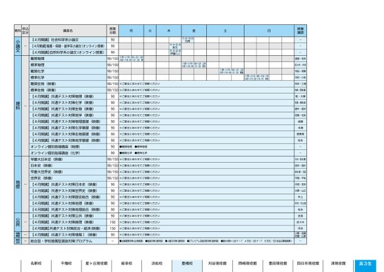 月火木金土日映像講映像講師師授業分数90909090/15090/15090/15090/15019:10〜20:40宮元19:10〜20:40伊藤(し)1月〜)19:50〜21:20岸4月〜)18:40〜21:2017:20〜18:50日髙1月〜)19:50〜21:204月〜)18:40〜21:20荒木1月〜)19:50〜21:204月〜)18:40〜21:20齋藤1月〜)14:40〜16:104月〜)13:30〜16:10中村---渡部・坂本佐々木・木村寺田・青野中村・小松向井・三浦牧島・西尾(健)乾・大學安達・西尾(源)唐牛・長井田島・松永加藤本瀬野黒美松永--大内・坂本(勝)田中・西川坂本(新)・沼田平尾・平松中垣・宮本大野・山口井上中村・中土居松本吉見佐々木河合小野・加賀佐藤・山家●出願書類対策(必須受講)●面接対策(選択制)●小論文対策(選択制)●【プレミアム】過去問対策(選択制)●慶大対策<(法)FITA方式/(法)FITB方式/(文)自主応募制推薦>-名駅校千種校星ヶ丘現役館岐阜校浜松校豊橋校刈谷現役館岡崎現役館豊田現役館四日市現役館津現役館高3生90/150※ご都合にあわせてご視聴ください90/150※ご都合にあわせてご視聴ください90909090909090909090※ご都合にあわせてご視聴ください※ご都合にあわせてご視聴ください※ご都合にあわせてご視聴ください※ご都合にあわせてご視聴ください※ご都合にあわせてご視聴ください※ご都合にあわせてご視聴ください※ご都合にあわせてご視聴ください※ご都合にあわせてご視聴ください●難関物理●標準物理●難関化学●標準化学90/150※ご都合にあわせてご視聴ください90/150※ご都合にあわせてご視聴ください90/150※ご都合にあわせてご視聴ください90/150※ご都合にあわせてご視聴ください※ご都合にあわせてご視聴ください※ご都合にあわせてご視聴ください※ご都合にあわせてご視聴ください※ご都合にあわせてご視聴ください※ご都合にあわせてご視聴ください※ご都合にあわせてご視聴ください※ご都合にあわせてご視聴ください※ご都合にあわせてご視聴ください※ご都合にあわせてご視聴ください90909090909015015090-講座名【4月開講】社会科学系小論文【4月開講】看護・保健・歯学系小論文(オンライン授業)【4月開講】自然科学系小論文(オンライン授業)難関物理標準物理難関化学標準化学難関生物(映像)標準生物(映像)【4月開講】共通テスト対策物理(映像)【4月開講】共通テスト対策化学(映像)【4月開講】共通テスト対策生物(映像)【4月開講】共通テスト対策地学(映像)【4月開講】共通テスト対策物理基礎(映像)【4月開講】共通テスト対策化学基礎(映像)【4月開講】共通テスト対策生物基礎(映像)【4月開講】共通テスト対策地学基礎(映像)オンライン個別指導講座(物理)オンライン個別指導講座(化学)早慶大日本史(映像)日本史(映像)早慶大世界史(映像)世界史(映像)【4月開講】共通テスト対策日本史(映像)【4月開講】共通テスト対策世界史(映像)【4月開講】共通テスト対策歴史総合(映像)【4月開講】共通テスト対策地理(映像)【4月開講】共通テスト対策地理総合(映像)【4月開講】共通テスト対策公共(映像)【4月開講】共通テスト対策倫理(映像)【4月開講】共通テスト対策政治・経済(映像)【4月開講】共通テスト対策情報Ⅰ(映像)総合型・学校推薦型選抜対策プログラム教科申込区分-小論文-理科-地歴---公民情報総合豊橋3ページ●2025年度/51/中部/豊橋/高3・卒生/パターン6620/2025_51_4_411_11_20240815134738.csv●4校了時削除