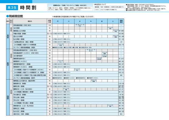 授業形式は、「対面」「オンライン」「映像」があります。「対面」「オンライン(集団)」:授業曜日・時間帯は、以下の時間割をご確認ください。「オンライン(個別)」「映像」:ご都合にあわせてご受講ください。*申込区分について認定制「認定(受講資格)」の取得が必要な講座です。ーどなたでも受講できる講座です。●受験対策講座(映像)のみのお申し込みはできません。受験対策講座(対面/オンライン〈総合型・学校推薦型選抜対策プログラムを除く〉)と組み合わせて、お申し込みください。●同一名称の講座は設置校舎・曜日・時間帯・授業形式が異なっても同一内容です。●担当講師は変更になる場合があります。あらかじめご了承ください。※映像授業は対面授業以外の曜日でもご受講いただけます。月火水木金土90/150※ご都合にあわせてご視聴ください18:30〜21:10市位18:10〜19:40中野20:00〜21:30中野20:00〜21:30渡邉授業分数15090909090909090150909090909090909090909090特別選抜英語(ONEWEX)名大英語難関国公立大英語早慶大英語(映像)国公立大英語私大英語(映像)入試頻出英文法・語法(映像)【4月開講】共通テスト対策英語オンライン個別指導講座(英語)特別選抜理系数学ⅢC(ONEWEX)特別選抜数学ⅠAⅡBC(ONEWEX)名大理系数学難関理系数学ⅢC難関数学ⅠAⅡBC標準理系数学ⅢC(映像)標準数学ⅠAⅡBC(映像)【4月開講】共通テスト対策数学ⅠAⅡBC【4月開講】共通テスト対策数学ⅠA(映像)【4月開講】共通テスト対策数学C「平面上の曲線と複素数平面」映像)オンライン個別指導講座(数学)難関国公立大現代文(論述対策)難関現代文(映像)難関古典(映像)難関古文(二次・私大対応)【4月開講】難関漢文(映像)早大現代文(映像)早大古典(映像)早大古文(映像)【4月開講】早大漢文(映像)標準現代文(二次・私大対応)標準古文(映像)私大古文(映像)漢文文法・句形(映像)認定制-認定制-認定制-英語数学国語高3生時間割岡崎●岡崎現役館教科申込区分講座名1ページ●2025年度/51/中部/岡崎/高3・卒生/パターン6620/2025_51_4_450_11_20240815134738.csv崎1校了時削除※ご都合にあわせてご視聴ください※ご都合にあわせてご視聴ください19:30〜21:00永瀬●難関国公立大英語●国公立大英語●私大英語●入試頻出英文法・語法18:30〜21:10佐々木19:30〜21:00福眞18:10〜19:40山田(龍)19:30〜21:00大上※ご都合にあわせてご視聴ください※ご都合にあわせてご視聴ください※ご都合にあわせてご視聴ください※ご都合にあわせてご視聴ください18:10〜19:40河合●難関理系数学ⅢC●難関数学ⅠAⅡBC●標準理系数学ⅢC●標準数学ⅠAⅡBC20:00〜21:30高橋※ご都合にあわせてご視聴ください19:30〜21:00福眞20:00〜21:30山田(龍)90/150※ご都合にあわせてご視聴ください906018:10〜19:40伊藤※ご都合にあわせてご視聴ください90/150※ご都合にあわせてご視聴ください90/150※ご都合にあわせてご視聴ください906090909090※ご都合にあわせてご視聴ください※ご都合にあわせてご視聴ください※ご都合にあわせてご視聴ください※ご都合にあわせてご視聴ください※ご都合にあわせてご視聴ください18:10〜19:40平野映像講映像講師師--佐野・胡摩﨑柴田(卓)・髙橋()安井・近藤吉川・大島小林柴田(祐)・守屋----依田・山本田・山本()原・宮田樋宮高梨・波平秦野・永島森本(啓)・清水森本(啓)・清水湘田--井上(真)・佐藤山村・坂下藤川・西川山村・坂下藤川・西川一瀬・菱山佐河・阿部髙橋・打越佐河・阿部髙橋・打越奥村・青木近藤・菅井重盛・松浦野村
