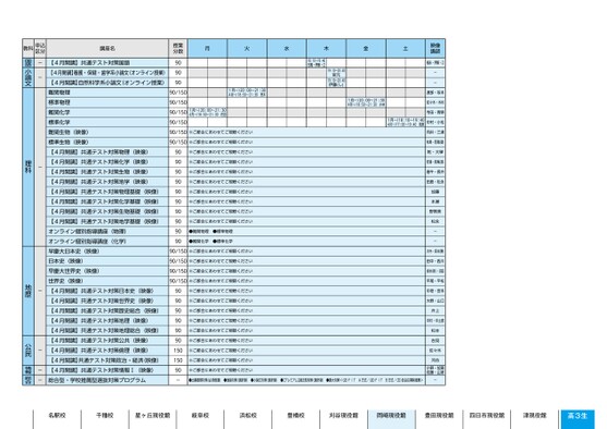月火水木金土映像講映像講師師授業分数90909090/15090/15090/15090/15018:10〜19:40日嵩・伊藤・江1月〜)20:00〜21:30荒木4月〜)18:50〜21:301月〜)20:00〜21:304月〜)18:50〜21:30花田19:10〜20:40宮元19:10〜20:40伊藤(し)1月〜)20:00〜21:304月〜)18:50〜21:30小林1月〜)18:10〜19:404月〜)17:00〜19:40若原福永・伊藤・江--渡部・坂本佐々木・木村寺田・青野中村・小松向井・三浦牧島・西尾(健)乾・大學安達・西尾(源)唐牛・長井田島・松永加藤本瀬野黒美松永--大内・坂本(勝)田中・西川坂本(新)・沼田平尾・平松中垣・宮本大野・山口井上中村・中土居松本吉見佐々木河合小野・加賀佐藤・山家●出願書類対策(必須受講)●面接対策(選択制)●小論文対策(選択制)●【プレミアム】過去問対策(選択制)●慶大対策<(法)FITA方式/(法)FITB方式/(文)自主応募制推薦>-名駅校千種校星ヶ丘現役館岐阜校浜松校豊橋校刈谷現役館岡崎現役館豊田現役館四日市現役館津現役館高3生90/150※ご都合にあわせてご視聴ください90/150※ご都合にあわせてご視聴ください90909090909090909090※ご都合にあわせてご視聴ください※ご都合にあわせてご視聴ください※ご都合にあわせてご視聴ください※ご都合にあわせてご視聴ください※ご都合にあわせてご視聴ください※ご都合にあわせてご視聴ください※ご都合にあわせてご視聴ください※ご都合にあわせてご視聴ください●難関物理●標準物理●難関化学●標準化学90/150※ご都合にあわせてご視聴ください90/150※ご都合にあわせてご視聴ください90/150※ご都合にあわせてご視聴ください90/150※ご都合にあわせてご視聴ください※ご都合にあわせてご視聴ください※ご都合にあわせてご視聴ください※ご都合にあわせてご視聴ください※ご都合にあわせてご視聴ください※ご都合にあわせてご視聴ください※ご都合にあわせてご視聴ください※ご都合にあわせてご視聴ください※ご都合にあわせてご視聴ください※ご都合にあわせてご視聴ください90909090909015015090-講座名【4月開講】共通テスト対策国語【4月開講】看護・保健・歯学系小論文(オンライン授業)【4月開講】自然科学系小論文(オンライン授業)難関物理標準物理難関化学標準化学難関生物(映像)標準生物(映像)【4月開講】共通テスト対策物理(映像)【4月開講】共通テスト対策化学(映像)【4月開講】共通テスト対策生物(映像)【4月開講】共通テスト対策地学(映像)【4月開講】共通テスト対策物理基礎(映像)【4月開講】共通テスト対策化学基礎(映像)【4月開講】共通テスト対策生物基礎(映像)【4月開講】共通テスト対策地学基礎(映像)オンライン個別指導講座(物理)オンライン個別指導講座(化学)早慶大日本史(映像)日本史(映像)早慶大世界史(映像)世界史(映像)【4月開講】共通テスト対策日本史(映像)【4月開講】共通テスト対策世界史(映像)【4月開講】共通テスト対策歴史総合(映像)【4月開講】共通テスト対策地理(映像)【4月開講】共通テスト対策地理総合(映像)【4月開講】共通テスト対策公共(映像)【4月開講】共通テスト対策倫理(映像)【4月開講】共通テスト対策政治・経済(映像)【4月開講】共通テスト対策情報Ⅰ(映像)総合型・学校推薦型選抜対策プログラム教科申込区分--国語小論文-理科-地歴---公民情報総合岡崎3ページ●2025年度/51/中部/岡崎/高3・卒生/パターン6620/2025_51_4_450_11_20240815134738.csv●4校了時削除