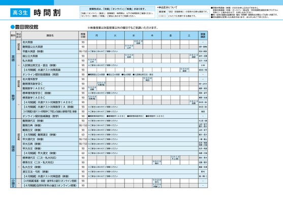 授業形式は、「対面」「オンライン」「映像」があります。「対面」「オンライン(集団)」:授業曜日・時間帯は、以下の時間割をご確認ください。「オンライン(個別)」「映像」:ご都合にあわせてご受講ください。*申込区分について認定制「認定(受講資格)」の取得が必要な講座です。ーどなたでも受講できる講座です。●受験対策講座(映像)のみのお申し込みはできません。受験対策講座(対面/オンライン〈総合型・学校推薦型選抜対策プログラムを除く〉)と組み合わせて、お申し込みください。●同一名称の講座は設置校舎・曜日・時間帯・授業形式が異なっても同一内容です。●担当講師は変更になる場合があります。あらかじめご了承ください。※映像授業は対面授業以外の曜日でもご受講いただけます。月火水木金土映像講映像講師師20:00〜21:30岩崎18:10〜19:40山本18:10〜19:40岩崎90/150※ご都合にあわせてご視聴ください18:10〜19:40山本※ご都合にあわせてご視聴ください●難関国公立大英語●国公立大英語●私大英語●入試頻出英文法・語法18:10〜19:40高田20:00〜21:30村瀬(竜)18:10〜19:40加藤※ご都合にあわせてご視聴ください18:10〜19:40村瀬(竜)※ご都合にあわせてご視聴ください※ご都合にあわせてご視聴ください●難関理系数学ⅢC●難関数学ⅠAⅡBC●標準理系数学ⅢC●標準数学ⅠAⅡBC※ご都合にあわせてご視聴ください90/150※ご都合にあわせてご視聴ください9060※ご都合にあわせてご視聴ください※ご都合にあわせてご視聴ください90/150※ご都合にあわせてご視聴ください90/150※ご都合にあわせてご視聴ください※ご都合にあわせてご視聴ください※ご都合にあわせてご視聴ください※ご都合にあわせてご視聴ください※ご都合にあわせてご視聴ください※ご都合にあわせてご視聴ください90609090909090909020:00〜21:30井上(真)20:00〜21:30横井19:10〜20:40宮元19:10〜20:40伊藤(し)20:00〜21:30渡部18:10〜19:40渡部20:00〜21:30加藤-佐野・胡摩﨑柴田(卓)・髙橋()安井・近藤吉川・大島小林柴田(祐)・守屋--依田・山本田・山本()原・宮田樋宮高梨・波平秦野・永島森本(啓)・清水森本(啓)・清水湘田-井上(真)・佐藤山村・坂下藤川・西川山村・坂下藤川・西川一瀬・菱山佐河・阿部髙橋・打越佐河・阿部髙橋・打越奥村・青木近藤・菅井重盛・松浦野村福永・伊藤・江--授業分数9090909090909090909090909090909090名大英語難関国公立大英語早慶大英語(映像)国公立大英語私大英語入試頻出英文法・語法(映像)【4月開講】共通テスト対策英語オンライン個別指導講座(英語)名大理系数学難関理系数学ⅢC難関数学ⅠAⅡBC標準理系数学ⅢC(映像)標準数学ⅠAⅡBC【4月開講】共通テスト対策数学ⅠAⅡBC【4月開講】共通テスト対策数学ⅠA(映像)【4月開講】共通テスト対策数学C「平面上の曲線と複素数平面」映像)オンライン個別指導講座(数学)難関現代文(映像)難関古典(映像)難関古文(映像)【4月開講】難関漢文(映像)早大現代文(映像)早大古典(映像)早大古文(映像)【4月開講】早大漢文(映像)標準現代文(二次・私大対応)標準古文(二次・私大対応)私大古文(映像)漢文文法・句形(映像)【4月開講】共通テスト対策国語(映像)【4月開講】看護・保健・歯学系小論文(オンライン授業)【4月開講】自然科学系小論文(オンライン授業)認定制-認定制-認定制--英語数学国語小論文高3生時間割豊田●豊田現役館教科申込区分講座名1ページ●2025年度/51/中部/豊田/高3・卒生/パターン6620/2025_51_4_449_11_20240815134738.csv田1校了時削除