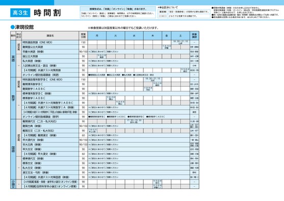 高3生時間割授業形式は、「対面」「オンライン」「映像」があります。「対面」「オンライン(集団)」:授業曜日・時間帯は、以下の時間割をご確認ください。「オンライン(個別)」「映像」:ご都合にあわせてご受講ください。*申込区分について認定制「認定(受講資格)」の取得が必要な講座です。ーどなたでも受講できる講座です。●受験対策講座(映像)のみのお申し込みはできません。受験対策講座(対面/オンライン〈総合型・学校推薦型選抜対策プログラムを除く〉)と組み合わせて、お申し込みください。●同一名称の講座は設置校舎・曜日・時間帯・授業形式が異なっても同一内容です。●担当講師は変更になる場合があります。あらかじめご了承ください。※映像授業は対面授業以外の曜日でもご受講いただけます。月火水木金土映像講映像講師師17:20〜18:50伊藤18:30〜21:10山岸-佐野・胡摩﨑柴田(卓)髙橋(慶)安井・近藤吉川・大島小林19:10〜20:40渡辺柴田(祐)・守屋--依田・山本田・()原・宮田樋高梨・波平秦野・永島森本(啓)・清水森本(啓)・清水湘田-井上(真)・佐藤山村・坂下山村・坂下$藤川・西川藤川・西川山村・坂下藤川・西川一瀬・菱山佐河・阿部髙橋・打越佐河・阿部髙橋・打越奥村・青木近藤・菅井重盛・松浦野村福永・伊藤・江--90/150※ご都合にあわせてご視聴ください19:30〜21:00桑野※ご都合にあわせてご視聴ください※ご都合にあわせてご視聴ください●難関国公立大英語●国公立大英語●私大英語●入試頻出英文法・語法18:30〜21:10河村19:30〜21:00嶋田17:20〜18:50河合※ご都合にあわせてご視聴ください17:30〜19:00鷲山19:20〜20:50鷲山※ご都合にあわせてご視聴ください※ご都合にあわせてご視聴ください●難関理系数学ⅢC●難関数学ⅠAⅡBC●標準理系数学ⅢC17:50〜19:20鈴木(理)岡●標準数学ⅠAⅡBC90/150※ご都合にあわせてご視聴ください906017:40〜19:10井上(淳)※ご都合にあわせてご視聴ください90/150※ご都合にあわせてご視聴ください90/150※ご都合にあわせてご視聴ください※ご都合にあわせてご視聴ください※ご都合にあわせてご視聴ください※ご都合にあわせてご視聴ください※ご都合にあわせてご視聴ください※ご都合にあわせてご視聴ください※ご都合にあわせてご視聴ください※ご都合にあわせてご視聴ください90609090909090909019:10〜20:40宮元19:10〜20:40伊藤(し)授業分数150909090909090150909090909090909090講座名特別選抜英語(ONEWEX)難関国公立大英語早慶大英語(映像)国公立大英語私大英語(映像)入試頻出英文法・語法(映像)【4月開講】共通テスト対策英語オンライン個別指導講座(英語)特別選抜理系数学ⅢC(ONEWEX)難関理系数学ⅢC難関数学ⅠAⅡBC標準理系数学ⅢC(映像)標準数学ⅠAⅡBC【4月開講】共通テスト対策数学ⅠAⅡBC【4月開講】共通テスト対策数学ⅠA(映像)【4月開講】共通テスト対策数学C「平面上の曲線と複素数平面」映像)オンライン個別指導講座(数学)難関現代文(二次・私大対応)難関古典(映像)難関古文(二次・私大対応)【4月開講】難関漢文(映像)早大現代文(映像)早大古典(映像)早大古文(映像)【4月開講】早大漢文(映像)標準現代文(映像)標準古文(映像)私大古文(映像)漢文文法・句形(映像)【4月開講】共通テスト対策国語(映像)【4月開講】看護・保健・歯学系小論文(オンライン授業)【4月開講】自然科学系小論文(オンライン授業)認定制-認定制-認定制--英語数学国語小論文●津現役館科申込区分津教1ページ●2025年度/51/中部/津/高3・卒生/パターン6620/2025_51_4_432_11_20240815134738.csv/校了時削除