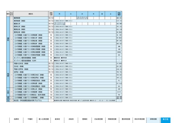 名駅校千種校星ヶ丘現役館岐阜校浜松校豊橋校刈谷現役館岡崎現役館豊田現役館四日市現役館津現役館高3生授業分数90/150月火水木金土1月〜)19:50〜21:204月〜)18:40〜21:20岸90/150※ご都合にあわせてご視聴ください1月〜)19:50〜21:204月〜)18:40〜21:20冨永90/15090/150※ご都合にあわせてご視聴ください90/150※ご都合にあわせてご視聴ください90/150※ご都合にあわせてご視聴ください90909090909090909090※ご都合にあわせてご視聴ください※ご都合にあわせてご視聴ください※ご都合にあわせてご視聴ください※ご都合にあわせてご視聴ください※ご都合にあわせてご視聴ください※ご都合にあわせてご視聴ください※ご都合にあわせてご視聴ください※ご都合にあわせてご視聴ください●難関物理●標準物理●難関化学●標準化学90/150※ご都合にあわせてご視聴ください90/150※ご都合にあわせてご視聴ください90/150※ご都合にあわせてご視聴ください90/150※ご都合にあわせてご視聴ください映像講映像講師師渡部・坂本佐々木・木村寺田・青野中村・小松向井・三浦牧島・西尾(健)乾・大學安達・西尾(源)唐牛・長井田島・松永加藤本瀬野黒美松永--大内・坂本(勝)田中・西川坂本(新)・沼田平尾・平松中垣・宮本大野・山口井上中村・中土居松本吉見佐々木河合小野・加賀佐藤・山家※ご都合にあわせてご視聴ください※ご都合にあわせてご視聴ください※ご都合にあわせてご視聴ください※ご都合にあわせてご視聴ください※ご都合にあわせてご視聴ください※ご都合にあわせてご視聴ください※ご都合にあわせてご視聴ください※ご都合にあわせてご視聴ください※ご都合にあわせてご視聴ください90909090909015015090-●出願書類対策(必須受講)●面接対策(選択制)●小論文対策(選択制)●【プレミアム】過去問対策(選択制)●慶大対策<(法)FITA方式/(法)FITB方式/(文)自主応募制推薦>-講座名難関物理標準物理(映像)難関化学標準化学(映像)難関生物(映像)標準生物(映像)【4月開講】共通テスト対策物理(映像)【4月開講】共通テスト対策化学(映像)【4月開講】共通テスト対策生物(映像)【4月開講】共通テスト対策地学(映像)【4月開講】共通テスト対策物理基礎(映像)【4月開講】共通テスト対策化学基礎(映像)【4月開講】共通テスト対策生物基礎(映像)【4月開講】共通テスト対策地学基礎(映像)オンライン個別指導講座(物理)オンライン個別指導講座(化学)早慶大日本史(映像)日本史(映像)早慶大世界史(映像)世界史(映像)【4月開講】共通テスト対策日本史(映像)【4月開講】共通テスト対策世界史(映像)【4月開講】共通テスト対策歴史総合(映像)【4月開講】共通テスト対策地理(映像)【4月開講】共通テスト対策地理総合(映像)【4月開講】共通テスト対策公共(映像)【4月開講】共通テスト対策倫理(映像)【4月開講】共通テスト対策政治・経済(映像)【4月開講】共通テスト対策情報Ⅰ(映像)総合型・学校推薦型選抜対策プログラム科申込区分津教-理科-地歴---公民情報総合2ページ●2025年度/51/中部/津/高3・卒生/パターン6620/2025_51_4_432_11_20240815134738.csv●校了時削除