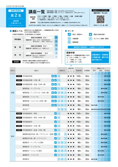※2025年4月から高2生の方対象受験対策講座高2生2025年1月スタート講座一覧受験対策講座(映像)のみのお申し込みはできません。受験対策講座(対面/オンライン)と組み合わせて、お申し込みください。Webサイトへアクセス!講座を探す・申し込む授業学期/講数授業時間スタート学期:9講、1学期:13講、2学期:13講〈年間35講〉※スタート学期:1〜3月/1学期:4〜7月/2学期:9〜12月※一部講座を除く。授業日程は45・46ページをご確認ください。下記に記載の授業時間に休憩時間は含みません。※一部講座には途中休憩があります。2026年1月からは新学年(高3生)のカリキュラムが開講します。講座ラインアップなどは2025年秋よりご案内します。2024/11/15(金)公開●講座レベル数字が大きいほど難度が高く、入試難易度の高い大学をめざす方向けの講座です。※受講の目安偏差値は、河合塾全統模試における偏差値特別選抜受講の目安偏差値65.0〜目標大学:東大・京大・医学部医学科東京科学大・一橋大・旧帝大など難関受講の目安偏差値55.0〜目標大学:難関国公立大・早慶大など標準受講の目安偏差値〜55.0目標大学:国公立大・GMARCH・その他私立大など認定制「認定制」講座の受講には認定が必要です。マークのない講座はどなたでも受講できます。654321●マーク:採点・添削あり:英語4技能を養う:対面授業:映像授業:オンライン授業(個別)映像授業の視聴期間は、入金確認から15カ月です。開講学期講座によって開講時期が異なります。ス:スタート学期(1〜3月)1:1学期(4〜7月)2:2学期(9〜12月)映像授業は、対面授業の開講以降、通年で視聴が可能です。教科名講座名認定制特別選抜英語認定制特別選抜英語-中高一貫認定制特別選抜英語-医進(中高一貫)難関英語-トップレベル英語難関英語-トップレベル(中高一貫)難関英語-ハイレベル難関英語-ハイレベル(中高一貫)標準英語英文法※1認定制特別選抜数学-理系認定制特別選抜数学-理系(中高一貫)認定制特別選抜数学認定制特別選抜数学-中高一貫認定制特別選抜数学-医進(中高一貫)数学難関理系数学中高一貫-アドバンスト(速習)難関数学中高一貫-アドバンスト難関数学-トップレベル理系難関数学-トップレベル難関数学-ハイレベル理系難関数学-ハイレベル標準数学授業形式開講学期ス12授業時間年間講数標準難関1234特別選抜56講座レベル●●●●●●●●●●●●●●●●●●●●●●●●●●●●●●●●●●●●●●●●●●●●●●●●●●●●●●●●●●●●●●150分150分150分90分90分90分90分90分90分150分150分150分150分150分90分90分90分90分90分90分90分35講35講35講35講35講35講35講35講26講35講35講35講35講35講35講35講35講35講35講35講35講
