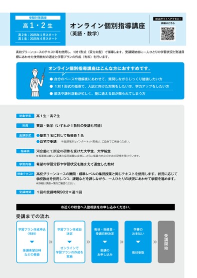 受験対策講座高1・2生高2生:2025年1月スタート高1生:2025年4月スタートオンライン個別指導講座(英語・数学)Webサイトへアクセス!詳細はこちら高校グリーンコースのテキスト等を使用し、1対1形式(双方向型)で指導します。受講開始前に一人ひとりの学習状況と到達目標にあわせた使用教材の選定と学習プランの作成(有料)を行います。オンライン個別指導講座はこんな方におすすめです。●自分のペースや理解度にあわせて、質問しながらじっくり勉強したい方●1対1形式の指導で、入試に向けた対策をしたい方、学力アップをしたい方●部活や課外活動が忙しく、塾に通える日が限られてしまう方対象学年高1生・高2生科目英語・数学(いずれか1教科の受講も可能)受講形式●塾生1名に対して指導員1名●自宅で受講※受講端末とインターネット環境は、ご自身でご用意ください。指導員河合塾にて所定の研修を受けた大学生、大学院生※指導員は厳しい基準の採用試験に合格し、さらに指導力向上のための研修を受けています。学習内容希望の学習分野や学習状況を踏まえて選定した教材対象テキスト高校グリーンコースの難関・標準レベルの集団授業と同じテキストを使用します。状況に応じて学校教材を併用しつつ、課題などを課しながら、一人ひとりの状況にあわせて学習を進めます。※詳細は講座一覧をご確認ください。受講時間1回の受講時間90分×週1回受講開始お近くの校舎へ入塾相談をお申し込みください。受講までの流れ学習プラン作成申込〈有料〉学習プラン作成日決定教材・指導員・受講日時決定学費のお支払い受講希望日時などの登録オンラインで学習プランの作成を実施受講のお申し込み教材受取