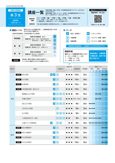 ※2025年4月から高3生の方対象受験対策講座高3生2025年1月スタート講座一覧受験対策講座(映像/総合型・学校推薦型選抜対策プログラム)のみのお申し込みはできません。受験対策講座(対面/オンライン〈総合型・学校推薦型選抜対策プログラムを除く〉)と組み合わせて、お申し込みください。Webサイトへアクセス!講座を探す・申し込む授業学期/講数授業時間スタート学期:9講、1学期:13講、2学期:13講〈年間35講〉※スタート学期:1〜3月/1学期:4〜7月/2学期:9〜12月※一部講座を除く。授業日程は73・74ページをご確認ください。下記に記載の授業時間に休憩時間は含みません。※一部講座には途中休憩があります。2024/11/15(金)公開●講座レベル数字が大きいほど難度が高く、入試難易度の高い大学をめざす方向けの講座です。※受講の目安偏差値は、河合塾全統模試における偏差値特別選抜受講の目安偏差値65.0〜目標大学:東大・京大・医学部医学科東京科学大・一橋大・旧帝大など難関受講の目安偏差値55.0〜目標大学:難関国公立大・早慶大など標準受講の目安偏差値〜55.0目標大学:国公立大・GMARCH・その他私立大など認定制「認定制」講座の受講には認定が必要です。マークのない講座はどなたでも受講できます。654321●マーク:採点・添削あり:リスニングあり:対面授業:映像授業:オンライン授業(個別):オンライン授業(集団)映像授業の視聴期間は、入金確認から2026年3月末までです。開講学期講座によって開講時期が異なります。ス:スタート学期(1〜3月)1:1学期(4〜7月)2:2学期(9〜12月)映像授業は、対面授業の開講以降、通年で視聴が可能です。教科名講座名授業形式認定制東大英語認定制京大英語認定制医進英語認定制特別選抜英語-国公立大難関国公立大英語英語早慶大英語※1国公立大英語GMARCH英語私大英語入試頻出英文法・語法共通テスト対策英語数学認定制東大理類数学認定制東大文類数学認定制京大理系数学認定制京大文系数学授業時間年間講数標準難関1234特別選抜56講座レベル開講学期ス12●●●●●●●●●●●●●●●150分150分150分150分90分35講35講35講35講35講35講35講35講35講22講26講35講35講35講35講●●●90分/150分●●●●●●●●●●●●●●●●●●●●●●●●●90分90分90分90分90分150分150分150分150分