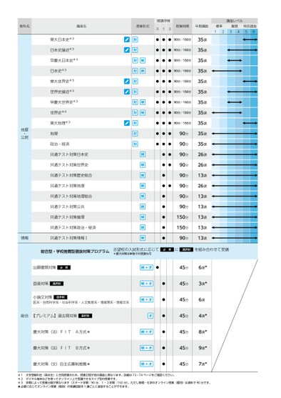 教科名講座名授業形式開講学期ス12授業時間年間講数標準難関1234特別選抜56講座レベル地歴公民・東大日本史※3日本史論述※3早慶大日本史※3日本史※3東大世界史※3世界史論述※3早慶大世界史※3世界史※3東大地理※3地理政治・経済共通テスト対策日本史共通テスト対策世界史共通テスト対策歴史総合共通テスト対策地理共通テスト対策地理総合共通テスト対策公共共通テスト対策倫理共通テスト対策政治・経済情報共通テスト対策情報Ⅰ●●●90分/150分●●●90分/150分●●●90分/150分●●●90分/150分●●●90分/150分●●●90分/150分●●●90分/150分●●●90分/150分●●●90分/150分●●●●●●●●●●●●●●●●●●90分90分90分90分90分90分90分90分150分150分90分35講35講35講35講35講35講35講35講35講35講35講26講26講13講26講13講13講13講13講13講総合型・学校推薦型選抜対策プログラム志望校の入試形式に応じて必須に選択制を組み合わせて受講*慶大対策は単独での受講も可出願書類対策必須面接対策選択制小論文対策医系・自然科学系・社会科学系・人文教育系・情報理系・情報文系選択制総合【プレミアム】過去問対策選択制慶大対策(法)FITA方式*慶大対策(法)FITB方式*慶大対策(文)自主応募制推薦*●45分6講★●●●●●●45分3講★45分6講45分4講★45分8講★45分9講★45分7講★※1大学受験科生(高卒生)と合同授業のため、授業日程が他の講座と異なります。詳細は73・74ページをご確認ください。※2デジタル端末などを使ってオンライン上で受講できるライブ型の授業です。※3学期によって授業分数が異なります(スタート学期:90分、1・2学期:150分)。ただし物理・化学のオンライン授業(個別)は通年で90分です。★必要に応じてオンライン授業(個別)の受講回数を1講ごとに追加することができます。