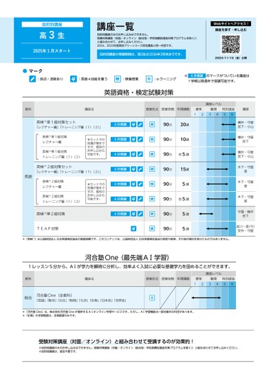 目的別講座高3生2025年1月スタート●マーク講座一覧目的別講座のみのお申し込みはできません。受験対策講座(対面/オンライン〈総合型・学校推薦型選抜対策プログラムを除く〉)と組み合わせて、お申し込みください。2024、2023年度高校グリーンコース同名講座と同一内容です。Webサイトへアクセス!講座を探す・申し込む目的別講座の受講期間は、高3生は2026年3月末までです。2024/11/15(金)公開:採点・添削あり:英語4技能を養う:映像授業:e-ラーニング英語資格・検定試験対策4月開講※のマークがついている講座は1学期以降通年で受講可能です。教科講座名授業形式授業時間年間講数標準難関講座レベル英語英検®準1級対策セット「レクチャー編」「トレーニング編(1)(2)」4月開講英検®準1級対策レクチャー編英検®準1級対策トレーニング編(1)(2)※セットでの受講が基本ですが、個別のお申し込みも可能です。4月開講4月開講英検®2級対策セット「レクチャー編」「トレーニング編(1)(2)」4月開講英検®2級対策レクチャー編英検®2級対策トレーニング編(1)(2)※セットでの受講が基本ですが、個別のお申し込みも可能です。英検®準2級対策TEAP対策4月開講4月開講4月開講123490分20講90分10講90分各5講90分15講90分5講90分各5講90分90分5講5講特別選抜56講師横井・守屋宮下・小山横井・守屋宮下横井・守屋宮下・小山木下・守屋堤木下・守屋堤木下・守屋堤守屋・横井宮下成川・森(千)安井・守屋*「英検®」は公益財団法人日本英語検定協会の登録商標です。このコンテンツは、公益財団法人日本英語検定協会の承認や推奨、その他の検討を受けたものではありません。河合塾One(最先端AⅠ学習)1レッスン5分から。AⅠが学力を瞬時に分析し、効率よく入試に必要な基礎学力を固めることができます。教科講座名授業形式授業時間年間講数標準難関1234特別選抜56講座レベル総合河合塾One(全教科)「英語」「数学」「古文」「物理」「化学」「生物」「日本史」「世界史」*「河合塾One」は、株式会社河合塾Oneが提供するAⅠオンライン学習サービスです。ただし、AⅠ学習機能は一部対象外の科目があります。*「生物」の学習範囲は、生物基礎のみです。受験対策講座(対面/オンライン)と組み合わせて受講するのが効果的!※目的別講座のみのお申し込みはできません。受験対策講座(対面/オンライン〈総合型・学校推薦型選抜対策プログラムを除く〉)と組み合わせてお申し込みください。※目的別講座は、認定不要です。
