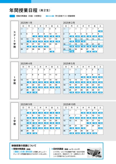 年間授業日程(高2生)受験対策講座(対面)の授業日学力診断テスト受験期間日月火水木金土1講1講1講1講1講1講2講2講2講2講2講2講3講3講3講3講3講3講4講4講4講4講4講4講5講5講日月火水木金土5講5講5講5講6講6講6講6講6講6講7講7講7講7講7講7講8講8講8講8講8講8講日月火水木金土3講3講3講3講4講4講4講4講4講4講5講5講5講5講5講5講6講6講6講6講6講6講日月火水木金土1講1講1講1講1講1講2講2講2講2講2講2講3講3講日月火水木金土1講1講1講1講1講1講2講2講2講2講2講2講3講3講3講3講2025年1月293031123456789101112131415161718192021222324252627282930311日月火水木金土3講3講4講4講4講4講4講4講5講5講5講6講6講5講5講5講6講6講6講2025年2月2025年4月3031123456789101112131415161718192021222324252627282930123スタート学期2025年5月27282930123456789101112131415161718192021222324252627282930311学期2025年10月2829301234567891011121314151617181920212223242526272829303112学期2025年9月311234567891011121314151617181920212223242526272829301234262728293031123456789101112131415161718192021222324252627281▶受験対策講座(映像)映像授業の受講について1講座につき週1講を目安に受講しましょう!チューターが受講計画を立てるサポートをします。▶目的別講座(映像・e-ラーニング)にあわせて、特定のテーマ・分野をピンポイいつでも・どこでも受講が可能!自分の目的ントで学習することができます。
