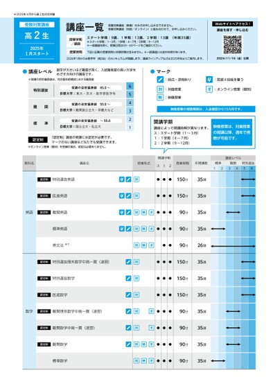 ※2025年4月から高2生の方対象受験対策講座高2生2025年1月スタート講座一覧受験対策講座(映像)のみのお申し込みはできません。受験対策講座(対面/オンライン)と組み合わせて、お申し込みください。Webサイトへアクセス!講座を探す・申し込む授業学期/講数授業時間スタート学期:9講、1学期:13講、2学期:13講〈年間35講〉※スタート学期:1〜3月/1学期:4〜7月/2学期:9〜12月※一部講座を除く。授業日程は59・60ページをご確認ください。下記に記載の授業時間に休憩時間は含みません。※一部講座には途中休憩があります。2026年1月からは新学年(高3生)のカリキュラムが開講します。講座ラインアップなどは2025年秋よりご案内します。2024/11/15(金)公開●マーク:採点・添削あり:英語4技能を養う:対面授業:映像授業:オンライン授業(個別)映像授業の視聴期間は、入金確認から15カ月です。開講学期講座によって開講時期が異なります。ス:スタート学期(1〜3月)1:1学期(4〜7月)2:2学期(9〜12月)映像授業は、対面授業の開講以降、通年で視聴が可能です。授業形式開講学期ス12授業時間年間講数標準難関1234特別選抜56講座レベル●●●150分35講●●●150分35講●●●90分35講●●●90分35講●●90分26講●●●150分35講●●●150分35講●●●150分35講●●●90分35講●●●90分35講●●●90分35講●●●90分35講●講座レベル数字が大きいほど難度が高く、入試難易度の高い大学をめざす方向けの講座です。※受講の目安偏差値は、河合塾全統模試における偏差値563412特別選抜難関標準受講の目安偏差値65.0〜目標大学:東大・京大・医学部医学科受講の目安偏差値55.0〜目標大学:難関国公立大・早慶大など受講の目安偏差値〜55.0目標大学:国公立大・私立大認定制「認定制」講座の受講には認定が必要です。マークのない講座はどなたでも受講できます。※オンライン授業(個別)を受講の場合、認定は必要ありません。教科名講座名認定制特別選抜英語認定制医進英語英語認定制難関英語標準英語英文法※1認定制特別選抜理系数学中高一貫(速習)認定制特別選抜数学認定制医進数学数学認定制難関理系数学中高一貫(速習)認定制難関数学中高一貫(速習)認定制難関数学標準数学