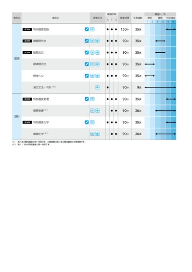 教科名講座名授業形式開講学期ス12授業時間年間講数標準難関1234特別選抜56講座レベル認定制特別選抜国語認定制難関現代文認定制難関古文国語標準現代文標準古文漢文文法・句形※2認定制特別選抜物理難関物理※1理科認定制特別選抜化学難関化学※1※1高1生の同名講座と同一内容です。対面授業は高1生の同名講座と合同授業です。※2高1・3生の同名講座と同一内容です。●●●150分35講●●●90分35講●●●90分35講●●●90分35講●●●90分35講●90分9講●●●90分35講●●90分26講●●●90分35講●●90分26講
