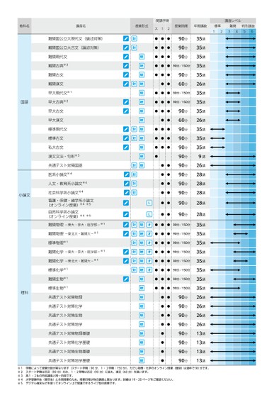 教科名講座名難関国公立大現代文(論述対策)難関国公立大古文(論述対策)国語小論文理科難関現代文難関古典※2難関古文難関漢文早大現代文※1早大古典※2早大古文早大漢文標準現代文標準古文私大古文漢文文法・句形※3共通テスト対策国語医系小論文※4人文・教育系小論文※4社会科学系小論文※4看護・保健・歯学系小論文(オンライン授業)※4※5自然科学系小論文(オンライン授業)※4※5難関物理-東大・京大・医学部-※1難関物理-東北大・難関大-※1標準物理※1難関化学-東大・京大・医学部-※1難関化学-東北大・難関大-※1標準化学※1難関生物※1標準生物※1共通テスト対策物理共通テスト対策化学共通テスト対策生物共通テスト対策地学共通テスト対策物理基礎共通テスト対策化学基礎共通テスト対策生物基礎共通テスト対策地学基礎授業形式開講学期ス12授業時間年間講数標準難関1234特別選抜56講座レベル●●●●●●●●●●●●●●●●●●●●●●●●●●●●●●●●●●●●●●●●●●●●●●●●●●●●●●●●●●●●●●●●●●●●●●●●●●●●●●●●●●●●●●90分90分90分90分/150分90分60分90分/150分90分/150分90分60分90分90分90分90分90分90分90分90分90分90分90分/150分90分/150分90分/150分90分/150分90分/150分90分/150分90分/150分90分/150分90分90分90分90分90分90分90分90分35講35講35講35講35講26講35講35講35講26講35講35講35講9講26講28講28講28講28講28講35講35講35講35講35講35講35講35講26講26講26講26講13講13講13講13講※1学期によって授業分数が異なります(スタート学期:90分、1・2学期:150分)。ただし物理・化学のオンライン授業(個別)は通年で90分です。※2スタート学期は古文(90分)のみ、1・2学期は古文(90分)に加え、漢文(60分)を扱います。※3高1・2生の同名講座と同一内容です。※4大学受験科生(高卒生)と合同授業のため、授業日程が他の講座と異なります。詳細は19・20ページをご確認ください。※5デジタル端末などを使ってオンライン上で受講できるライブ型の授業です。