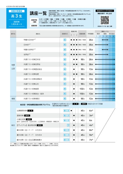 ※2025年4月から高3生の方対象受験対策講座高3生2025年1月スタート講座一覧受験対策講座(映像/総合型・学校推薦型選抜対策プログラム)のみのお申し込みはできません。受験対策講座(対面/オンライン〈総合型・学校推薦型選抜対策プログラムを除く〉)と組み合わせて、お申し込みください。Webサイトへアクセス!講座を探す・申し込む授業学期/講数授業時間スタート学期:9講、1学期:13講、2学期:13講〈年間35講〉※スタート学期:1〜3月/1学期:4〜7月/2学期:9〜12月※一部講座を除く。授業日程は19・20ページをご確認ください。下記に記載の授業時間に休憩時間は含みません。※一部講座には途中休憩があります。2024/11/15(金)公開講座レベル授業時間年間講数標準難関1234特別選抜56教科名講座名授業形式開講学期ス12地歴・公民早慶大日本史※1日本史※1早慶大世界史※1世界史※1共通テスト対策日本史共通テスト対策世界史共通テスト対策歴史総合共通テスト対策地理共通テスト対策地理総合共通テスト対策公共共通テスト対策倫理共通テスト対策政治・経済情報共通テスト対策情報Ⅰ●●●90分/150分●●●90分/150分●●●90分/150分●●●90分/150分●●●●●●●●●●●●90分90分90分90分90分90分150分150分90分35講35講35講35講26講26講13講26講13講13講13講13講13講総合型・学校推薦型選抜対策プログラム志望校の入試形式に応じて必須に選択制を組み合わせて受講*慶大対策は単独での受講も可出願書類対策必須面接対策選択制小論文対策医系・自然科学系・社会科学系・人文教育系・情報理系・情報文系選択制総合【プレミアム】過去問対策選択制慶大対策(法)FITA方式*慶大対策(法)FITB方式*慶大対策(文)自主応募制推薦*※1学期によって授業分数が異なります(スタート学期:90分、1・2学期:150分)。★必要に応じてオンライン授業(個別)の受講回数を1講ごとに追加することができます。●●●●●●●45分45分45分45分45分45分45分6講★3講★6講4講★8講★9講★7講★