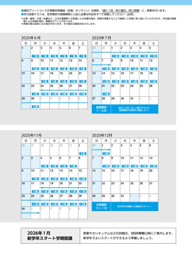 ●高校グリーンコースの受験対策講座(対面/オンライン)は原則、「週に1回、同じ曜日、同じ時間」に、授業を行います。●学力診断テストは、各学期末の受験期間に入試に必要な科目をすべて受験してください(必須)。※台風・豪雨・大雪・地震など、公共交通機関への影響による休講の場合、映像を視聴することで継続して学習に取り組んでいただけます。河合塾の諸事情による休講の場合、補講を行うことがあります。※授業日程は変更になる場合があります。その場合は随時お知らせします。2025年6月2025年7月日月火水木金土34567日29月30火水木金土1234518297講7講7講7講7講7講11講11講11講11講11講101112131467891011128講8講8講8講8講8講11講12講12講12講12講12講15161718192021131415161718199講9講9講9講9講12講13講13講13講13講13講22232425262728202122232425269講10講10講10講10講10講2930123452713講282930311210講夏期講習7~8月差がつく夏!忙しい夏だからこそ、夏期講習で効率的に勉強しよう!292025年11月日26月27火28水29木30金31345672025年12月日30112講87月火水木金土29345610111213土9講189講9講9講9講13講13講13講13講13講13講101112131415141516171819209講10講10講10講10講10講161718192021222122232425262710講11講11講11講11講11講232425262728292829303112311講12講12講12講12講12講30123456冬期講習12~1月次の学年を意識した勉強をスタート!2026年1月新学年スタート学期開講授業やカリキュラムなどの詳細は、2025年秋以降にご案内します。新学年でよいスタートができるよう準備しましょう。