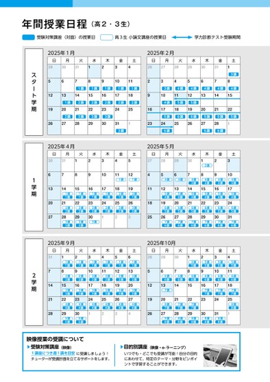 年間授業日程(高2・3生)受験対策講座(対面)の授業日学力診断テスト受験期間高3生小論文講座の授業日日月火水木金土1講2講1講2講1講1講1講1講1講1講1講1講1講2講1講2講2講2講2講2講2講2講2講2講3講2講3講2講3講3講3講3講2講3講2025年4月3031123456789101112131415161718192021222324252627282930123スタート学期日月火水木金土3講2講4講4講4講3講4講3講4講3講4講3講4講5講4講5講4講5講4講5講4講5講4講5講6講5講6講5講6講5講6講5講6講5講6講5講6講7講6講7講6講7講6講7講6講7講6講7講2025年5月27282930123456789101112131415161718192021222324252627282930311学期日月火水木金土5講5講5講5講5講5講5講5講6講6講6講6講6講6講6講6講6講6講6講6講7講7講7講7講7講7講7講8講7講7講7講7講7講8講8講9講8講8講8講8講8講8講8講8講8講2025年10月2829301234567891011121314151617181920212223242526272829303112学期日月火水木金土1講1講1講1講1講1講1講1講1講1講1講1講2講2講2講2講2講2講2講2講2講2講2講2講3講3講3講3講3講3講3講3講3講3講3講3講4講4講4講4講4講4講4講4講4講4講4講4講5講5講5講5講2025年9月311234567891011121314151617181920212223242526272829301234日月火水木金土1講1講1講1講1講1講2講2講2講2講2講2講3講3講3講3講2025年1月293031123456789101112131415161718192021222324252627282930311日月火水木金土3講3講4講4講4講4講4講4講5講5講5講6講6講5講5講5講6講6講6講2025年2月262728293031123456789101112131415161718192021222324252627281映像授業の受講について▶受験対策講座(映像)▶目的別講座(映像・e-ラーニング)にあわせて、特定のテーマ・分野をピンポイいつでも・どこでも受講が可能!自分の目的ントで学習することができます。1講座につき週1講を目安に受講しましょう!チューターが受講計画を立てるサポートをします。