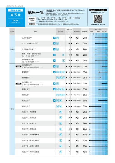 講座一覧受験対策講座(映像/総合型・学校推薦型選抜対策プログラム)のみのお申し込みはできません。受験対策講座(対面/オンライン〈総合型・学校推薦型選抜対策プログラムを除く〉)と組み合わせて、お申し込みください。Webサイトへアクセス!講座を探す・申し込む授業学期/講数授業時間スタート学期:9講、1学期:13講、2学期:13講〈年間35講〉※スタート学期:1〜3月/1学期:4〜7月/2学期:9〜12月※一部講座を除く。授業日程は61・62ページをご確認ください。下記に記載の授業時間に休憩時間は含みません。※一部講座には途中休憩があります。2024/11/15(金)公開講座レベル授業時間年間講数標準難関1234特別選抜56※2025年4月から高3生の方対象受験対策講座高3生2025年1月スタート教科名講座名授業形式開講学期ス12医系小論文※1人文・教育系小論文※1小論文社会科学系小論文※1看護・保健・歯学系小論文(オンライン授業)※1※2自然科学系小論文(オンライン授業)※1※2認定制特別選抜物理(ONEWEX東・京・医)※3難関物理※3標準物理※3認定制特別選抜化学(ONEWEX東・京・医)※3理科難関化学※3標準化学※3難関生物※3標準生物※3共通テスト対策物理共通テスト対策化学共通テスト対策生物共通テスト対策地学共通テスト対策物理基礎共通テスト対策化学基礎共通テスト対策生物基礎共通テスト対策地学基礎●●●●90分90分28講28講●●90分28講●●●●90分90分●●●90分/150分●●●90分/150分●●●90分/150分●●●90分/150分●●●90分/150分●●●90分/150分●●●90分/150分●●●90分/150分28講28講35講35講35講35講35講35講35講35講●●90分26講●●90分26講●●90分26講●●90分26講●●●●90分13講90分13講90分90分13講13講