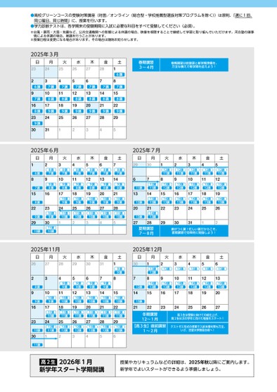 ●高校グリーンコースの受験対策講座(対面/オンライン〈総合型・学校推薦型選抜対策プログラムを除く〉)は原則、「週に1回、同じ曜日、同じ時間」に、授業を行います。●学力診断テストは、各学期末の受験期間に入試に必要な科目をすべて受験してください(必須)。※台風・豪雨・大雪・地震など、公共交通機関への影響による休講の場合、映像を視聴することで継続して学習に取り組んでいただけます。河合塾の諸事情による休講の場合、補講を行うことがあります。※授業日程は変更になる場合があります。その場合は随時お知らせします。日月火水木金土6講8講7講8講7講8講7講8講7講8講7講8講7講7講9講8講9講8講9講8講9講8講9講8講9講8講8講9講10講9講10講9講10講9講10講9講10講9講10講9講11講10講11講10講11講10講11講10講11講10講10講10講11講2025年6月日月火水木金土12講11講12講11講12講11講12講11講12講11講11講12講11講13講12講13講12講13講12講13講12講13講12講12講12講13講13講14講13講14講13講14講13講14講13講14講13講14講13講2025年7月日月火水木金土9講9講8講9講9講9講9講9講9講9講9講9講10講9講10講10講10講10講10講10講10講10講10講10講11講10講11講11講11講11講11講11講11講11講11講11講10講12講11講12講12講12講12講12講12講12講12講12講12講11講2025年11月26272829303119101112131415161718192021222324252627282930123456日月火水木金土13講12講13講13講13講13講13講12講14講13講14講13講14講13講14講13講14講13講14講13講13講2025年12月2821292230233124125226327冬期講習12~1月高3生は受験に向けての総仕上げ、高2生は次の学年に向けた勉強をスタート!【高3生】直前講習1~2月テストゼミ形式の授業で入試本番対策も万全。いざ、志望大学現役合格へ!夏期講習7~8月差がつく夏!忙しい夏だからこそ、夏期講習で効率的に勉強しよう!2高2生2026年1月新学年スタート学期開講授業やカリキュラムなどの詳細は、2025年秋以降にご案内します。新学年でよいスタートができるよう準備しましょう。日月火水木金土6講6講7講7講7講7講7講7講7講8講8講8講8講8講8講8講9講9講9講9講9講9講9講2025年3月23242526272812345678910111213141516171819202122232425262728293031123453~4月春期講習春期講習は総復習と新学期準備を。万全な備えで新学期を迎えよう!1234567891011121314151617181920212223242526272829301234529301234567891011121314151617181920212223242526272829303112345678301234567891011121314151617181920