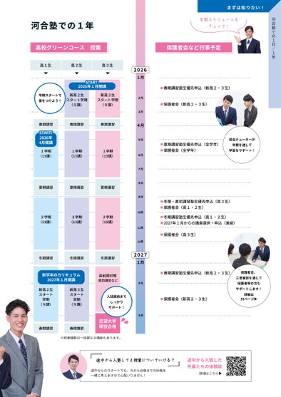 河合塾での1日/1年まずは知りたい!年間スケジュールをチェック!保護者会など行事予定■春期講習塾生優先申込(新高2・3生)■保護者会(新高2・3生)■夏期講習塾生優先申込(全学年)■保護者会(全学年)担当チューターが学習をサポート!年間を通して■冬期・直前講習塾生優先申込(高3生)■保護者会(高1・2生)■冬期講習塾生優先申込(高1・2生)■����年1月からの講座選択・申込(進級)■保護者会(高3生)■春期講習塾生優先申込(新高2・3生)■保護者会(新高2・3生)保護者会、三者面談を通じて保護者等の方もサポートします!詳細は��ページ▶����1月2月3月4月5月6月7月8月9月��月��月��月����1月2月3月河合塾での1年高校グリーンコース授業高1生高2生高3生START!����年1月開講スタート学期新高2生〈9講〉スタート学期新高3生〈9講〉春期講習春期講習1学期〈��講〉1学期〈��講〉早期スタートで差をつけよう!春期講習START!����年�月開講1学期〈��講〉夏期講習夏期講習夏期講習2学期〈��講〉2学期〈��講〉2学期〈��講〉冬期講習冬期講習冬期講習新学年のカリキュラム����年1月開講新高2生スタート〈9講〉学期新高3生スタート〈9講〉学期直前期対策直前講習など入試直前までしっかりサポート!志望大学現役合格春期講習春期講習※授業講数は一部異なる講座もあります。途中から入塾しても授業についていける?途中からのスタートでも、今から合格までの計画を一緒に考えますので心配いりません!途中から入塾した先輩たちの体験談詳細はこちら▶