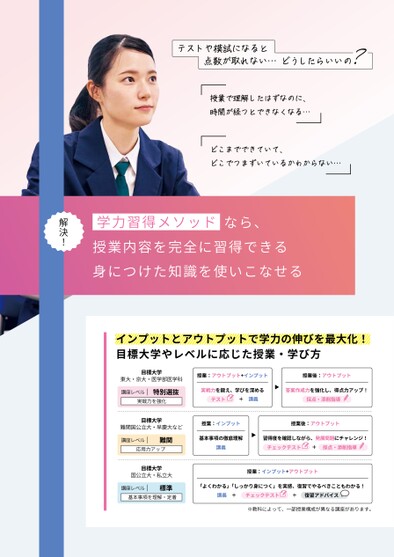 テストや模試になると点数が取れない…どうしたらいいの?授業で理解したはずなのに、時間が経つとできなくなる…どこまでできていて、どこでつまずいているかわからない…なら、学力習得メソッド授業内容を完全に習得できる身につけた知識を使いこなせる解決!インプットとアウトプットで学力の伸びを最大化!目標大学やレベルに応じた授業・学び方目標大学東大・京大・医学部医学科特別選抜講座レベル授業:アウトプット+インプット実戦力を鍛え、学びを深める▶テスト+講義実戦力を強化目標大学難関国公立大・早慶大など講座レベル難関応用力アップ授業:インプット基本事項の徹底理解講義▶授業後:アウトプット答案作成力を強化し、得点力アップ!採点・添削指導授業後:アウトプット習得度を確認しながら、発展問題にチャレンジ!チェックテスト+採点・添削指導目標大学国公立大・私立大標準基本事項を理解・定着講座レベル授業:インプット+アウトプット「よくわかる」「しっかり身につく」を実感、復習でやるべきこともわかる!講義+チェックテスト※教科によって、一部授業構成が異なる講座があります。復習アドバイス+