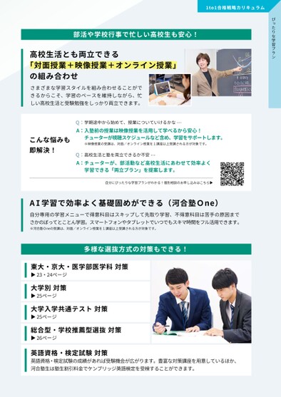 ぴったりな学習プラン�to�合格戦略カリキュラム部活や学校行事で忙しい高校生も安心!高校生活とも両立できる「対面授業+映像授業+オンライン授業」の組み合わせさまざまな学習スタイルを組み合わせることができるからこそ、学習のペースを維持しながら、忙しい高校生活と受験勉強をしっかり両立できます。こんな悩みも即解決!※映像授業の受講は、対面/オンライン授業を1講座以上受講される方が対象です。Q:学期途中から始めて、授業についていけるかな…A:入塾前の授業は映像授業を活用して学べるから安心!チューターが視聴スケジュールなど含め、学習をサポートします。Q:高校生活と塾を両立できるか不安…A:チューターが、部活動など高校生活にあわせて効率よく学習できる「両立プラン」を提案します。自分にぴったりな学習プランがわかる!個別相談のお申し込みはこちら▶AI学習で効率よく基礎固めができる(河合塾One)自分専用の学習メニューで得意科目はスキップして先取り学習、不得意科目は苦手の原因までさかのぼってとことん学習。スマートフォンやタブレットでいつでもスキマ時間をフル活用できます。※河合塾Oneの受講は、対面/オンライン授業を1講座以上受講される方が対象です。多様な選抜方式の対策もできる!東大・京大・医学部医学科対策▶��・��ページ大学別対策▶��ページ大学入学共通テスト対策▶��ページ総合型・学校推薦型選抜対策▶��ページ英語資格・検定試験対策英語資格・検定試験の成績があれば受験機会が広がります。豊富な対策講座を用意しているほか、河合塾生は塾生割引料金でケンブリッジ英語検定を受検することができます。