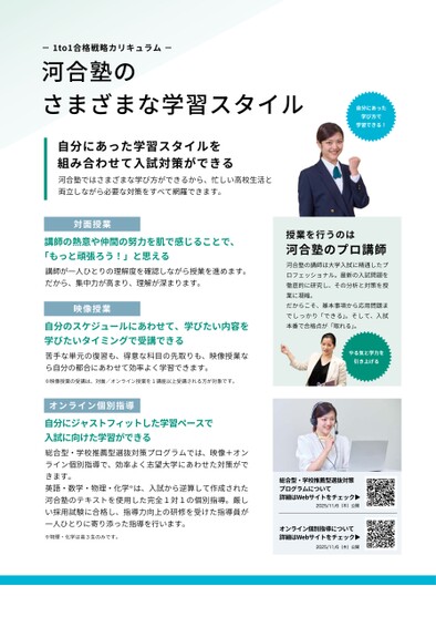 -�to�合格戦略カリキュラム-河合塾のさまざまな学習スタイル自分にあった学習スタイルを組み合わせて入試対策ができる河合塾ではさまざまな学び方ができるから、忙しい高校生活と両立しながら必要な対策をすべて網羅できます。自分にあった学習できる!学び方で対面授業講師の熱意や仲間の努力を肌で感じることで、「もっと頑張ろう!」と思える講師が一人ひとりの理解度を確認しながら授業を進めます。だから、集中力が高まり、理解が深まります。映像授業自分のスケジュールにあわせて、学びたい内容を学びたいタイミングで受講できる苦手な単元の復習も、得意な科目の先取りも、映像授業なら自分の都合にあわせて効率よく学習できます。※映像授業の受講は、対面/オンライン授業を1講座以上受講される方が対象です。授業を行うのは河合塾のプロ講師河合塾の講師は大学入試に精通したプロフェッショナル。最新の入試問題を徹底的に研究し、その分析と対策を授業に凝縮。だからこそ、基本事項から応用問題までしっかり「できる」。そして、入試本番で合格点が「取れる」。やる気と学力を引き上げるオンライン個別指導自分にジャストフィットした学習ペースで入試に向けた学習ができる総合型・学校推薦型選抜対策プログラムでは、映像+オンライン個別指導で、効率よく志望大学にあわせた対策ができます。英語・数学・物理・化学※は、入試から逆算して作成された河合塾のテキストを使用した完全1対1の個別指導。厳しい採用試験に合格し、指導力向上の研修を受けた指導員が一人ひとりに寄り添った指導を行います。※物理・化学は高3生のみです。総合型・学校推薦型選抜対策プログラムについて詳細はWebサイトをチェック▶2025/11/6(木)公開オンライン個別指導について詳細はWebサイトをチェック▶2025/11/6(木)公開