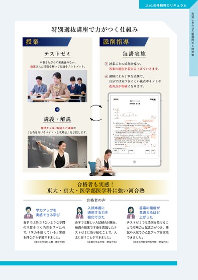 �to�合格戦略カリキュラム志望にあわせた徹底的な入試対策特別選抜講座で力がつく仕組みテストゼミ本番さながらの緊張感のなか、厳選された問題を解いて知識をアウトプット。毎講実施授業ごとの添削指導で、答案の精度を着実に上げていきます。講師による丁寧な添削で、自分では気づきにくい減点ポイントや改善点が明確になります。+講義・解説難関大入試に精通した講師が「合否を分けるポイントと攻略法」を伝授します。合格者も実感!東大・京大・医学部医学科に強い河合塾学力アップを実感できる学び自学では気づけないような学問の本質をつく内容を学べたので、「学力を鍛えている」実感を得ながら学習できました。合格者の声入試本番に通用する力を強化できた自学では難しい入試傾向対策を、毎週の授業で本番を意識したテストゼミに取り組むことで、入念に行うことができました。答案の精度が見違えるほど上がったテストゼミでは添削を受けることで応用力と記述力がつき、模試や入試での点数アップを実現できました。(東京大学文科二類現役合格)(京都大学工学部現役合格)(筑波大学医学群医学類現役合格)