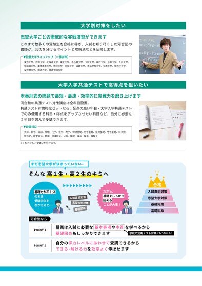 大学別対策をしたい志望大学ごとの徹底的な実戦演習ができますこれまで数多くの受験生を合格に導き、入試を知り尽くした河合塾の講師が、合否を分けるポイントと攻略法などを伝授します。▼設置大学ラインアップ(一部抜粋)東京大学、京都大学、北海道大学、東北大学、名古屋大学、大阪大学、神戸大学、広島大学、九州大学、早稲田大学、慶應義塾大学、明治大学、中央大学、法政大学、青山学院大学、立教大学、同志社大学、立命館大学、関西大学、関西学院大学大学入学共通テストで高得点を狙いたい本番形式の問題で最短・最速・効率的に実戦力を磨き上げます河合塾の共通テスト対策講座は全科目設置。共通テスト対策強化セットなら、配点の高い科目・大学入学共通テストでのみ使用する科目・得点をアップさせたい科目など、自分に必要な2科目を選んで受講できます。▼設置科目英語、数学、国語、物理、化学、生物、地学、物理基礎、化学基礎、生物基礎、地学基礎、日本史、世界史、歴史総合、地理、地理総合、公共、倫理、政治・経済、情報Ⅰ※1科目でもご受講いただけます。まだ志望大学が決まっていない…そんな高1生・高2生のキミへ合格入試直前対策志望大学対策め固基礎だから、基礎をしっかり固めることが大事!基礎力が不十分のまま受験学年をむかえると…河合塾ならPOINT1POINT2入試直前対策志望大学対策基礎完成基礎固め授業は入試に必要な基本事項や本質を学べるから基礎固めもしっかりできます自分の学力レベルにあわせて受講できるからできる・解ける力を効率よく伸ばせます学校の定期テスト対策にもつながる!