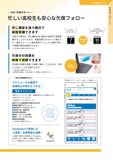 やむを得ない理由で欠席違う曜日や他校舎の同じ講座で受講7(火)振替受講制度10(金)自宅で映像視聴▶「塾生マイページ」ログイン後のトップ画面イメージMy塾生マイページ高校グリーンコース予定学習実績目標面談KJ通信毎日頑張れていますね!学習計画も一緒に登録してみよう!2026年09月今日前週翌週今月のスケジュールをチェック14月)17:40〜18:40授業●●校601高3早大漢文第02講欠席・振替申請19:00〜20:30授業●●校601高3早大古文第02講欠席・振替申請15火)17:00〜19:40授業●●校402高3早大現代文第03講欠席・振替申請16水)18:00〜20:40授業●●校402高3早慶大世界史第03講欠席・振替申請予約・申込欠席・振替自習室のお知らせ答案提出・オンライン指導模試ナビStudyplus学習環境/欠席フォロー���°学習サポート-���°学習サポート-忙しい高校生も安心な欠席フォロー同じ講座を違う曜日で振替受講できます欠席する場合は、同じ講座を違う曜日や他校舎で振替受講することができます。振替受講できなかった場合でも、「塾生マイページ(塾生専用サイト)」から授業で扱った問題の解答を確認できます。※一部対象外の講座や校舎があります。欠席分の授業を映像で視聴できます河合塾の授業を映像※で視聴(無料)できるため、欠席した分もしっかり学習できます。※一部対象外の講座があります。※映像授業の講師は、対面で受講している講師とは原則異なります。塾生も保護者等の方もスケジュールの確認や各種申込手続きもできる!塾生マイページ「塾生マイページ」は、塾生・保護者等の方と河合塾をつなぐ大切なサポートツールです。*保護者用サイトもご用意しています。●校舎への入退館情報や授業の出欠状況●授業や模試のスケジュール●英語音声データのダウンロード※●授業の欠席・振替申請※●自習室の開室時間●模試・テストゼミの成績※●模試・イベントの申し込み●授業の解答閲覧※※一部対象外の講座があります。タブレットやパソコンからアクセス可能スマートフォン・いつでもどこでもStudyplusで登録した入退館・出席情報も連携!入退館や授業の出席登録も「Studyplus」を利用します。登録した情報は、塾生マイページで確認することができます。