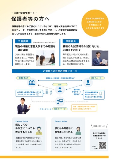 -���°学習サポート-保護者等の方へ保護者等の方にもご安心いただけるように、進路・受験指導のプロであるチューターが年間を通して手厚くサポート。ご家庭でのお話に役立てていただけるよう、最新の大学入試情報も提供します。合格までの進捗状況を正確に知ることが、大きな支えになりますお子様にとって(保護者等の方+生徒+チューター)三者面談現在の成績と志望大学までの距離を一緒に確認入試に関する豊富な知識を基に、今後の学習計画についてご説明いたします。保護者会最新の入試情報や入試に向けた心構えをお伝え毎年変化する大学入試制度に関する正しい知識と、時期に応じた心構えをお伝えするため、年に数回行います。ご家庭と河合塾の連携イメージ保護者等の方保護者会・三者面談・入試情報の提供など担当チューター生徒お子様の入退館をご登録いただいたメールアドレスへお知らせ登校学習サポート進学相談面談などお子様の面談状況は塾生マイページで見ることができるので安心サポートツール塾生マイページ出席・成績状況やお子様との面談状況をご確認いただけます。ParentVoice親としてのあり方についても教えてもらえたParentVoice子どもの気持ちに寄り添ってくれる保護者会では入試情報だけでなく、受験に際しての親の立ち位置についても教えていただき参考になりました。面談の際、不安な気持ちに寄り添いつつ、的確なアドバイスをくださり親子ともに前向きな気持ちになることができました。河合塾で良かった!安心できる環境と保護者等の方へのサポート詳細はこちら▶