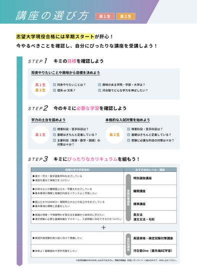 講座の選び方高1生高2生志望大学現役合格には早期スタートが肝心!今やるべきことを確認し、自分にぴったりな講座を受講しよう!STEP1キミの目標を確認しよう将来やりたいことや興味から目標を決めよう高1生高2生将来やりたいことは?理系or文系?興味のある学問・学部・大学は?河合塾でどんな学力を伸ばしたい?STEP2今のキミに必要な学習を確認しよう学力の土台を固めよう高1生得意科目・苦手科目は?基礎はきちんと定着している?主要科目(英語・数学・国語)の対策は十分?本格的な入試対策を始めよう高2生得意科目・苦手科目は?基礎はきちんと定着している?受験に必要な科目の対策は十分?STEP3キミにぴったりなカリキュラムを組もう!おすすめのレベル・講座特別選抜講座標準講座英文法漢文文法・句形難関講座受験対策講座目標大学や学習目的▶東大・京大・医学部医学科をめざしている▶演習を重ねて実戦力をつけたい▶旧帝大などの難関国公立大・早慶大をめざしている▶基本事項の理解と発展的内容をバランスよく学習したい▶国公立大やGMARCH・関関同立大などの私立大をめざしている▶基本事項の理解と定着をしたい▶英語の得意・不得意問わず英文法を基礎から体系的に学びたい▶漢文読解に必要な基礎知識をマスターし、入試問題に対応できる力をつけたい+※目的別講座のみのお申し込みはできません。受験対策講座(対面/オンライン)と組み合わせて、お申し込みください。英語資格・検定試験対策講座河合塾One(最先端AI学習)目的別講座▶英語外部試験利用入試に向けて準備したい▶効率よく基礎固めや苦手克服をしたい