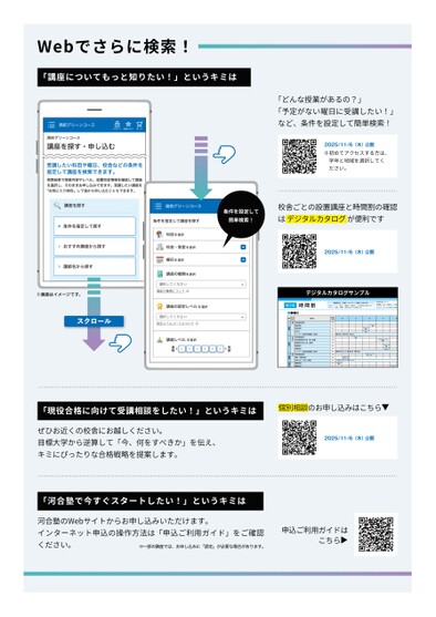 「どんな授業があるの?」「予定がない曜日に受講したい!」など、条件を設定して簡単検索!2025/11/6(木)公開※初めてアクセスする方は、学年と地域を選択してください。校舎ごとの設置講座と時間割の確認はデジタルカタログが便利です2025/11/6(木)公開デジタルカタログサンプル時間割授業形式は、「対面」「オンライン」「映像」があります。「対面」「オンライン(集団):授業曜日・時間帯は、以下の時間割をご確認ください。「オンライン(個別)「映像」:ご都合にあわせてご受講ください。*申込区分について認定制「認定(受講資格)」の取得が必要な講座です。ーどなたでも受講できる講座です。高3生大阪●●●校●受験対策講座(映像)のみのお申し込みはできませ受験対策講座(対面/オンライン〈総合型・学校を除く〉)と組み合わせて、お申し込みください。●同一名称の講座は設置校舎・曜日・時間帯・授業形式●担当講師は変更になる場合があります。あらかじめ月火水木金土映像講師19:021:0清水18:0〜21:2国松18:019:018:019:0清水香川●難関英語●標準英語●英文法18:0〜21:0寺尾18:0〜2:0藤野19:021:0河村19:021:0山本(洋)●難関数学中高一貫●難関数学●標準数学19:021:0野口()・仲※ご都合にあわせてご視聴ください18:019:0植田18:0〜21:0畑中・阪上19:0〜1:0木村18:019:0西-佐野・清水市位・胡摩﨑成川・木下----山本()府木田中・塚本--畑中・仲野村長谷川・原田中村・若原授業分数150909090901501509090909015090909090特別選抜英語難関英語標準英語英文法オンライン個別指導講座(英語)特別選抜数学特別選抜数学中高一貫(速習)難関数学中高一貫(速習)難関数学標準数学オンライン個別指導講座(数学)特別選抜国語難関・標準国語漢文文法・句形(映像)難関物理難関化学認定-認定制-認定制--英語数学国語理科教科申込区分講座名1ページ●2025年度/51/近畿/大阪/高1生/パターン6617/2025_51_5_511_31_20240815153005.svWebでさらに検索!「講座についてもっと知りたい!」というキミは発展123456基礎講座レベルを選択高校グリーンコースログインお気に入りカート高校グリーンコース講座を探す・申し込む受講したい科目や曜日、校舎などの条件を指定して講座を検索できます。検索結果で授業内容やレベル、設置校舎情報を確認して講座を選択し、そのままお申し込みできます。受講したい講座を「お気に入り保存」して後から申し込むこともできます。講座を探す条件を指定して探すおすすめ講座から探す講師名から探す※画面はイメージです。スクロール高校グリーンコース条件を指定して講座を探す科目を選択校舎・教室を選択曜日を選択講座の種類を選択選択してください講座の種類について講座の認定レベルを選択選択してください認定レベルコードについてログインカートお気に入り条件を設定して簡単検索!2025/11/6(木)公開個別相談のお申し込みはこちら▲校了時削除「現役合格に向けて受講相談をしたい!」というキミはぜひお近くの校舎にお越しください。目標大学から逆算して「今、何をすべきか」を伝え、キミにぴったりな合格戦略を提案します。「河合塾で今すぐスタートしたい!」というキミは河合塾のWebサイトからお申し込みいただけます。インターネット申込の操作方法は「申込ご利用ガイド」をご確認ください。※一部の講座では、お申し込みに「認定」が必要な場合があります。申込ご利用ガイドはこちら▲