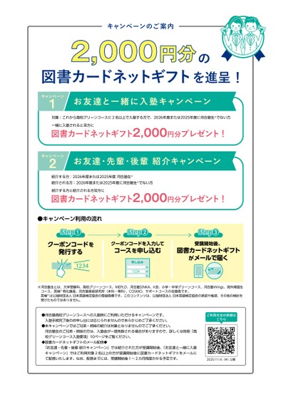 キャンペーンのご案内2025年度難関大合格実績桁違いの合格実績!これが、河合塾2,000円分の圧倒的難関国立大図書カードネットギフトを進呈!医学部医学科計7,974名計4289名※2お友達と一緒に入塾キャンペーン早慶大▶名古屋大学▶大阪大学▶神戸大学▶広島大学▶九州大学………704名…………777名…………678名…………438名…………596名計9,848名▶東京大学▶京都大学▶北海道大学▶東北大学▶東京科学大学▶一橋大学………1,174名………1,420名キャンペーン………709名…………753名……339名…………386名1対象:これから高校グリーンコースに2名以上で入塾する方で、2026年度または2025年度に河合塾生※でない方一緒に入塾されると双方に図書カードネットギフト2,000円分プレゼント!の中でNo.�(オルフェウスコンサルティング株式会社調べ)。※1����年度合格実績をWebサイト・パンフレットで公表している予備校※2国公立大学医学部医学科計と私立大学医学部医学科計の合計です。*この合格実績は、����年度入試における河合塾グループ関連法人の生徒の合格状況についてまとめたものです。各大学の合格者数は、河合塾グループ関連法人の在籍者および講習受講生の集計であり、公開模試のみの受験生は含まれていません。ただし一人で複数の大学・学部・学科に合格した場合は、それぞれに合格者として計上しています。まだまだあります!合格実績・合格者の声▶▶▶※1お友達・先輩・後輩紹介キャンペーン学年表示について紹介する方と紹介される方双方に紹介する方:2026年度または2025年度河合塾生※紹介される方:2026年度または2025年度に河合塾生※でない方����年度河合塾高校グリーンコースにおける学年(在籍期間)は以下のとおりです。●高1生:����年4月~��月末日図書カードネットギフト2,000円分プレゼント!●高2生:����年1月~��月末日●高3生:����年1月~����年3月末日※学校の学年(在学期間)とは異なりますのでご注意ください。��������Step❷デジタル端末の使用についてStep❸クーポンコードを入力してコースを申し込む受講開始後、対面授業の予習・復習・授業(*)において、また映像授業やe-ラーニングの講座では、タブレット・スマートフォン、パソコンなどインターネットに接続できるデジタル端末を使用します。ご受講いただくには、デジタル端末が必要です。対応端末・動作推奨環境は下記のとおりです。推奨環境を満たしていれば、お持ちの端末をそのまま使用いただけます。(*)一部講座では授業の中でもデジタル端末を使用します。詳しくはWebサイト図書カードネットギフトがメールで届く申し込み1234の「講座案内」にてご確認ください。キャンペーンクーポンコードを●キャンペーン利用の流れ2CONTENTS●OB・OG合格者インタビュー●まずは知りたい!河合塾での1日/1年●志望大学現役合格への「最短ルート」学力習得メソッド●理解度・定着度を高める学び方●テキスト・教材Step❶●採点・添削指導●学力を伸ばす仕組み�to�合格戦略カリキュラム●ぴったりな学習プラン●河合塾のさまざまな学習スタイル●志望にあわせた徹底的な入試対策���°学習サポート��●質問・相談●グッド学習サイクル●受験・進学サポート●学習環境/欠席フォロー●保護者等の方へ/塾生特典講座の選び方●講座の選び方高1生・高2生●講座の選び方高3生●Webでさらに検索!◆図書カードネットギフトのメール配信◆��������発行する1234��※河合塾生とは、大学受験科、高校グリーンコース、MEPLO、河合塾SⅠNKA、K会、小学・中学グリーンコース、河合塾Winɡs、海外帰国生コース、英検特化講座、河合塾美術研究所(本科・専科)、COSMO、サポートコースの在籍者です。英検は公益財団法人日本英語検定協会の登録商標です。このコンテンツは、公益財団法人日本英語検定協会の承認や推奨、その他の検討を受けたものではありません。(無線LAN)環境を整備しております。対応端末・動作推奨環境(2025年8月現在)●Wi-Fiについて河合塾の校舎では、河合塾の学習コンテンツが利用できるWi-Fi〈タブレット/スマートフォン〉【OS:iOS16以降、iPadOS16以降】●河合塾高校グリーンコースへの入塾時にご利用いただけるキャンペーンです。入塾手続完了後のお申し出には応じられませんのであらかじめご了承ください。●本キャンペーンではご兄弟・姉妹の紹介は対象となりませんのでご了承ください。河合塾生のご兄弟・姉妹の方は、入塾金が一部免除される場合がありますので、詳しくは別冊「高ブラウザ:Safariの最新バージョン【OSndrod12.0以降】ブラウザ:GoogleChromeの最新バージョン〈パソコン〉【OS:Windows11】校グリーンコース入塾要項」10ページをご覧ください。ご利用方法の詳細はこちら「お友達・先輩・後輩紹介キャンペーン」では紹介された方が受講開始後、「お友達と一緒に入塾キャンペーン」ではご利用対象2名以上の方が受講開始後に図書カードネットギフトをメールにて配信い