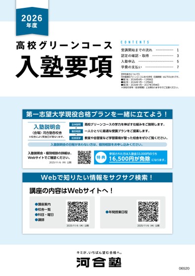 2026年度高校グリーンコース入塾要項受講開始までの流れ認定の確認・取得入塾申込学費の支払い……………………………………………………………………………1357【学年表示について】河合塾高校グリーンコースにおける学年(在籍期間)は以下のとおりです。●高1生:2026年4月〜12月末日●高2生:2026年1月〜12月末日●高3生:2026年1月〜2027年3月末日※学校の学年(在学期間)とは異なりますのでご注意ください。第一志望大学現役合格プランを一緒に立てよう!入塾説明会〈会場〉河合塾各校舎※校舎により実施日が異なります。全体説明++個別相談校舎見学高校グリーンコースの学力を伸ばす仕組みをご説明します。一人ひとりに最適な受講プランをご提案します。教室や自習室など学習環境が整った校舎をぜひご覧ください。入塾説明会の日程があわない方は、個別相談をお申し込みください。入塾説明会・個別相談の詳細は、Webサイトでご確認ください。2025/11/6(木)公開特典参加された方は入塾金33,000円のうちになります。16,500円が免除Webで知りたい情報をサクサク検索!講座の内容はWebサイトへ!●講座案内●校舎一覧●科目・曜日●講師●年間授業日程2025/11/6(木)公開2025/11/6(木)公開06520