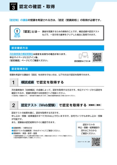 認定テストの申込・受験・結果確認の流れはこちらからご確認ください。2025/11/6(木)公開講座を受講するための資格のことです。模試成績や認定テストなどで、一定の学力基準をクリアした場合に取得できます。「認定」とは…認定「認定制」の講座の受講を希望される方は、「認定(受講資格)」の取得が必要です。認定確認方法河合塾実施の模試受験生は認定をお持ちの場合があります。申込マイページにログイン後、「認定確認」ページにてご確認ください。認定確認はこちら▶認定取得方法受講を希望する講座の「認定」をお持ちでない方は、以下の方法で認定を取得できます。1模試成績で認定を取得する河合塾実施の「全統模試」の成績によって、認定を取得する方法です。申込マイページから認定を確認されるか、受講を希望する校舎窓口へご相談ください。※「認定制」の講座のうち、一部対象外の講座もあります。詳細は受講希望校舎にお問い合わせください。2認定テスト(Web受験)で認定を取得する受験料:無料3STEP認定の確認・取得認定テストの結果を基に、認定を取得する方法です。申し込み・受験・結果確認のすべてをWeb上で行いますので、自宅でいつでもお申し込み・受験が可能です。また、受験後は認定結果をすぐに確認できます。●試験時間:1教科60分●認定テストの出題範囲:Webサイトにてご確認ください。●受験教科:英語・数学・国語※受講希望講座によって必要な教科が異なります。詳細は右記二次元コードからご確認ください。※認定希望教科を選択して受験してください。