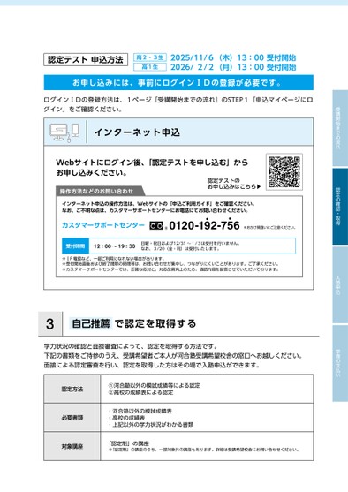 受講開始までの流れ認定の確認・取得入塾申込学費の支払い認定テスト申込方法高2・3生高1生2025/11/6(木)13:00受付開始2026/2/2(月)13:00受付開始お申し込みには、事前にログインⅠDの登録が必要です。ログインⅠDの登録方法は、1ページ「受講開始までの流れ」のSTEP1「申込マイページにログイン」をご確認ください。インターネット申込Webサイトにログイン後、「認定テストを申し込む」からお申し込みください。操作方法などのお問い合わせインターネット申込の操作方法は、Webサイトの「申込ご利用ガイド」をご確認ください。なお、ご不明な点は、カスタマーサポートセンターにお電話にてお問い合わせください。認定テストのお申し込みはこちら▶・・カスタマーサポートセンター0120-192-756※おかけ間違いにご注意ください。受付時間12:00〜19:30日曜・祝日および12/31〜1/3は受付を行いません。なお、3/20(金・祝)は受付いたします。※ⅠP電話など、一部ご利用になれない場合があります。※受付開始直後および終了間際の時間帯は、お問い合わせが集中し、つながりにくいことがあります。ご了承ください。※カスタマーサポートセンターでは、正確な応対と、対応品質向上のため、通話内容を録音させていただいております。3自己推薦で認定を取得する学力状況の確認と面接審査によって、認定を取得する方法です。下記の書類をご持参のうえ、受講希望者ご本人が河合塾受講希望校舎の窓口へお越しください。面接による認定審査を行い、認定を取得した方はその場で入塾申込ができます。認定方法必要書類対象講座①河合塾以外の模試成績等による認定②高校の成績表による認定・河合塾以外の模試成績表・高校の成績表・上記以外の学力状況がわかる書類「認定制」の講座※「認定制」の講座のうち、一部対象外の講座もあります。詳細は受講希望校舎にお問い合わせください。