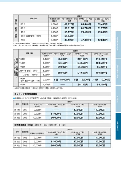 受講開始までの流れ認定の確認・取得入塾申込学費の支払い授業料1講あたりの授業料スタート学期(1~3月)9講1学期(4~7月)13講2学期(9~12月)13講6,880円6,290円6,130円6,560円3,680円61,920円56,610円55,170円59,040円33,120円89,440円81,770円79,690円――89,440円81,770円79,690円――47,840円47,840円授業分数150分120分90分90分(漢文文法・句形)75分高2生対面/映像*上記以外の講数の講座は「1講あたりの授業料×講数」が授業料となります。*高1・2エンリッチコース(東海高校・南山高校(女子部)対象)の授業料は千種校へお問い合わせください。1講あたりの授業料スタート学期(1~3月)9講1学期(4~7月)13講2学期(9~12月)13講授業料8,470円8,050円6,560円6,560円8,050円76,230円72,450円59,040円59,040円110,110円104,650円85,280円110,110円104,650円85,280円104,650円104,650円3,000円6講18,000円/5講15,000円/4講12,000円授業分数180分150分90分スタート学期90分1・2学期150分90分(数学重要テーマ対策ユニット)高3生対面/映像/オンライン(集団)60分4,470円――58,110円58,110円*上記以外の講数の講座は「1講あたりの授業料×講数」が授業料となります。オンライン個別指導講座●受講前にオンラインにて学習プランの作成(費用:1回45分1,500円)を行います。学年授業分数高1生高2生高3生90分90分90分1講あたりの授業料9,000円9,000円10,000円スタート学期(1~3月)9講――81,000円90,000円授業料1学期(4~7月)13講2学期(9~12月)13講117,000円117,000円130,000円117,000円117,000円130,000円個別指導講座(対面)広島校(高1・2生)福岡校(高1・2・3生)学年授業分数1講あたりの授業料高1生高2生高3生90分90分90分9,000円9,000円10,000円スタート学期(1~3月)9講――81,000円90,000円授業料1学期(4~7月)13講2学期(9~12月)13講117,000円117,000円130,000円117,000円117,000円130,000円