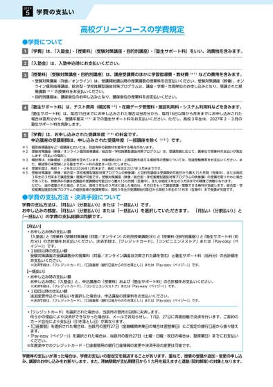 5STEP学費の支払い●学費について高校グリーンコースの学費規定12345「学費」は、「入塾金」・「授業料」(受験対策講座・目的別講座)・「塾生サポート料」をいい、消費税を含みます。「入塾金」は、入塾申込時にお支払いください。「授業料」(受験対策講座・目的別講座)は、講座受講費のほかに学習指導費・教材費(※1)などの費用を含みます。受験対策講座(対面/オンライン)は、受講開始講以降の授業講数の授業料をお支払いください。受験対策講座(映像)、オンライン個別指導講座、総合型・学校推薦型選抜対策プログラムは、講座・学期・年間単位のお申し込みとなり、受講された授業講数(※2)の授業料をお支払いください。目的別講座は、講座単位のお申し込みとなり、講座単位の授業料をお支払いください。「塾生サポート料」は、テスト費用(模試等※3)・在籍データ管理料・施設利用料・システム利用料などを含みます。「塾生サポート料」は、毎月15日までにお申し込みされた場合は当月分から、毎月16日以降から月末までにお申し込みされた場合は翌月分から、受講年度末(※4)までの塾生サポート料をお支払いください。ただし、高校3年生は、2027年2・3月の塾生サポート料を免除します。「学費」は、お申し込みされた受講年度(※4)の料金です。申込講座の受講期間は、申し込みされた受講年度(一部講座を除く(※5))です。※1個別指導講座など一部講座においては、別途有料の副教材を使用する場合があります。※2受験対策講座(映像/オンライン個別指導講座/総合型・学校推薦型選抜対策プログラム)は、受講実績に応じて、講単位で授業料の支払いが発生します(月払いの場合)。※3模試等は、対象模試・上限回数を定めています。対象模試以外・上限回数を超える模試等の受験については、別途受験費用をお支払いください。また、模試等の未受験による塾生サポート料の返金は一切いたしません。※4受講年度は、高校1・2年生は2026年12月末まで、高校3年生は2027年3月末までです。※5受験対策講座(映像/総合型・学校推薦型選抜対策プログラムの映像講)と目的別講座は受講開始可能日から最大15カ月間(在籍中)、または高校3年生の3月末まで講座受講・閲覧が可能です。受験対策講座(映像/総合型・学校推薦型選抜対策プログラムの映像講)の受講を取りやめた場合であっても、視聴済みの講は各講座の受講開始可能日から最大15カ月間(在籍中)、または高校3年生の3月末までの期間ご視聴になれます。ただし、途中退塾された場合、または、高校3年生の3月末に達した場合は、その日をもって講座受講・閲覧できる権利が消滅します。総合型・学校推薦型選抜対策プログラムの個別指導の受講期間は、高校3年生の受講開始可能日から高校3年生の11月末(在籍中)まで受講が可能です。●学費の支払方法・決済手段について学費の支払方法は、「月払い(分割払い)」または「一括払い」です。お申し込みの都度、「月払い(分割払い)」または「一括払い」を選択していただきます。「月払い(分割払い)」と「一括払い」の学費の支払総額は同額です。【月払い】お申し込み時の支払い額「入塾金」と「授業料(受験対策講座(対面/オンライン)の初月授業講数分)」と「授業料(目的別講座)」と「塾生サポート料(初月分)」の合計額をお支払いください。決済手段は、「クレジットカード」、「コンビニエンスストア」または「Pay-easy(ペイジー)」です。2回目以降の支払い額受験対策講座の受講講数分の授業料(対面/オンライン講座は欠席された講を含む)と塾生サポート料(当月分)の合計額をお支払いください。※決済手段は、「クレジットカード」、「口座振替(銀行口座からの引き落とし)」または「Pay-easy(ペイジー)」です。【一括払い】お申し込み時の支払い額お申し込み時に「入塾金」と、申込講座の「授業料」および「塾生サポート料」の合計額をお支払いください。※決済手段は、「クレジットカード」、「コンビニエンスストア」または「Pay-easy(ペイジー)」です。2回目以降の支払い額追加変更申込で一括払いを選択した場合は、申込講座の授業料をお支払いください。※決済手段は、「クレジットカード」、「口座振替(銀行口座からの引き落とし)」または「Pay-easy(ペイジー)」です。「クレジットカード」を選択された場合は、当該月の翌月8日頃に決済します。何らかの理由により決済ができなかった場合は、メールでお知らせし、17日、27日に再度自動で決済を行います。ご契約のカード会社により支払日(引き落とし日)が異なります。「口座振替」を選択された場合は、当該月の翌月27日(金融機関休業日の場合は翌営業日)にご指定の銀行口座から振り替え「Pay-easy(ペイジー)」を選択された場合は、当該月の翌月27日(土曜・日曜・祝日の場合は、翌営業日)までにお支払います。ください。※年度途中でのクレジットカード・口座振替用の銀行口座情報の変更や決済手段の変更は可能です。学費等の支払いが滞った場合は、学費お