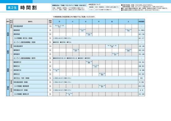時間割授業形式は、「対面」「オンライン」「映像」があります。「対面」:授業曜日・時間帯は、以下の時間割をご確認ください。「オンライン(個別)」「映像」:ご都合にあわせてご受講ください。*申込区分について認定制「認定(受講資格)」の取得が必要な講座です。ーどなたでも受講できる講座です。●受験対策講座(映像)のみのお申し込みはできません。受験対策講座(対面/オンライン)と組み合わせて、お申し込みください。●同一名称の講座は設置校舎・曜日・時間帯・授業形式が異なっても同一内容です。●担当講師は変更になる場合があります。あらかじめご了承ください。高2生札幌教科申込区分1ページ●2026年度/51/北海道/札幌/高2生/パターン4617/2026_51_1_151_32_20250817140816.csv校了時削除※映像授業は対面授業以外の曜日でもご受講いただけます。月火水木金土映像講師18:20〜21:00松山※ご都合にあわせてご視聴ください●難関英語●標準英語●英文法18:10〜19:40本井20:00〜21:30太田20:00〜21:30田中●難関理系数学中高一貫●難関数学中高一貫●難関数学●標準数学16:20〜17:50宇田18:10〜19:40長岡18:50〜21:30石部20:00〜21:30田中20:00〜21:30篠原18:10〜19:40川本20:00〜21:30福田20:00〜21:30島村18:10〜19:40一路※ご都合にあわせてご視聴ください※ご都合にあわせてご視聴ください※ご都合にあわせてご視聴ください18:10〜19:40堀-村上・髙橋(保)成川・大島成川・木下-大庭・水嶋依田・合田河合・吉嗣-光田・清水伊藤・菅井一路・斎藤田中・酒井野村乾・窪田長谷川・原田金・原中村・若原授業分数15090909090150909090909090909090909090講座名特別選抜英語難関英語標準英語【4月開講】英文法(映像)オンライン個別指導講座(英語)特別選抜数学認定制-認定制英語オンライン個別指導講座(数学)難関数学-標準数学数学漢文文法・句形(映像)特別選抜物理(映像)【4月開講】難関物理特別選抜化学(映像)【4月開講】難関化学認定制-認定制-難関現代文難関古文-標準現代文標準古文国語理科