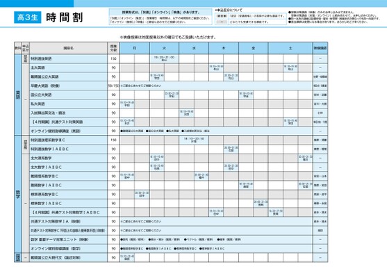 時間割授業形式は、「対面」「オンライン」「映像」があります。「対面」「オンライン(集団)」:授業曜日・時間帯は、以下の時間割をご確認ください。「オンライン(個別)」「映像」:ご都合にあわせてご受講ください。*申込区分について認定制「認定(受講資格)」の取得が必要な講座です。ーどなたでも受講できる講座です。●受験対策講座(映像)のみのお申し込みはできません。受験対策講座(対面/オンライン)と組み合わせて、お申し込みください。●同一名称の講座は設置校舎・曜日・時間帯・授業形式が異なっても同一内容です。●担当講師は変更になる場合があります。あらかじめご了承ください。※映像授業は対面授業以外の曜日でもご受講いただけます。月火水木金土映像講師講座名授業分数150909018:20〜21:00松山18:10〜19:40宇田18:10〜19:40松山20:00〜21:30松山18:10〜19:40松山18:10〜19:40宇田ーー佐野・胡摩﨑柴田(卓)・髙橋(慶)安井・近藤吉川・大島小林柴田(祐)・守屋ー樋原・須藤秦野・堀尾20:00〜21:30福井ーー依田・山本20:00〜21:30石部樋原・宮田高梨・波平秦野・永島森本・清水森本・清水湘田ーーー90/150※ご都合にあわせてご視聴ください90909090901509090909090909090909090909020:00〜21:30宇田18:10〜19:40宇田18:10〜19:40宇田18:10〜19:40本井18:10〜19:40太田●難関国公立大英語●国公立大英語●私大英語●入試頻出英文法・語法18:10〜20:50片岡18:10〜19:40田中18:10〜19:40石部18:10〜19:40田中20:00〜21:30福井20:00〜21:30田中※ご都合にあわせてご視聴ください※ご都合にあわせてご視聴ください20:00〜21:30石部20:00〜21:30田中18:10〜19:40長岡18:10〜19:40田中20:00〜21:30長岡16:20〜17:50長岡●数列(難関/標準)●微分・積分(難関/標準)●ベクトル(難関/標準)●確率(難関/標準)●難関理系数学ⅢC●難関数学ⅠAⅡBC●標準理系数学ⅢC●標準数学ⅠAⅡBC18:10〜19:40篠原入試頻出英文法・語法【4月開講】共通テスト対策英語オンライン個別指導講座(英語)特別選抜理系数学ⅢC特別選抜数学ⅠAⅡBC認定制北大理系数学北大数学ⅠAⅡBC難関理系数学ⅢC難関数学ⅠAⅡBC標準理系数学ⅢC-標準数学ⅠAⅡBC【4月開講】共通テスト対策数学ⅠAⅡBC共通テスト対策数学ⅠA(映像)共通テスト対策数学C「平面上の曲線と複素数平面」映像)数学重要テーマ対策ユニット(映像)オンライン個別指導講座(数学)-難関国公立大現代文(論述対策)数学国語難関国公立大英語早慶大英語(映像)特別選抜英語認定制北大英語国公立大英語私大英語-英語高3生札幌教科申込区分1ページ●2026年度/51/北海道/札幌/高3・卒生/パターン4617/2026_51_1_151_11_20250817181006.csv校了時削除