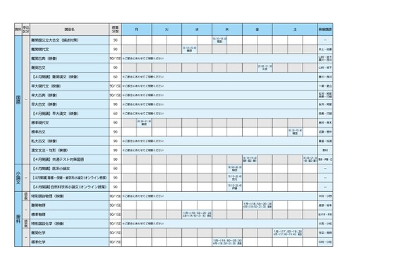 月火水木金土18:10〜19:40福田18:10〜19:40篠原20:00〜21:30川本18:10〜19:40福田18:10〜19:40篠原・福田・藤川20:00〜21:30一路・福田・藤川福永・伊藤・江18:50〜20:20田19:10〜20:40宮元19:10〜20:40伊藤特別選抜物理(映像)90/150※ご都合にあわせてご視聴ください難関物理標準物理90/15090/1501月〜)18:50〜20:204月〜)18:50〜21:30島村1月〜)18:50〜20:204月〜)18:50〜21:30島村特別選抜化学(映像)90/150※ご都合にあわせてご視聴ください難関化学標準化学90/15090/1501月〜)18:50〜20:204月〜)18:50〜21:30高田1月〜)17:00〜18:304月〜)17:00〜19:40高田認定制-認定制-映像講師ー井上・佐藤山村・坂下藤川・西川山村・坂下藤川・西川一瀬・菱山佐河・阿部髙橋・打越佐河・阿部髙橋・打越奥村・青木近藤・菅井重盛・松浦野村ーーー木村・小野渡部・坂本佐々木・木村大髙・小松寺田・青野中村・小松授業分数909090/150※ご都合にあわせてご視聴ください9060※ご都合にあわせてご視聴ください90/150※ご都合にあわせてご視聴ください90/150※ご都合にあわせてご視聴ください※ご都合にあわせてご視聴ください※ご都合にあわせてご視聴ください20:00〜21:30篠原※ご都合にあわせてご視聴ください※ご都合にあわせてご視聴ください90609090909090909090標準現代文標準古文私大古文(映像)漢文文法・句形(映像)【4月開講】共通テスト対策国語【4月開講】医系小論文-【4月開講】看護・保健・歯学系小論文(オンライン授業)【4月開講】自然科学系小論文(オンライン授業)札幌教科申込区分講座名難関国公立大古文(論述対策)難関現代文難関古典(映像)難関古文【4月開講】難関漢文(映像)早大現代文(映像)【4月開講】早大漢文(映像)早大古典(映像)早大古文(映像)-国語3ページ●2026年度/51/北海道/札幌/高3・卒生/パターン4617/2026_51_1_151_11_20250817181006.csv校了時削除小論文理科