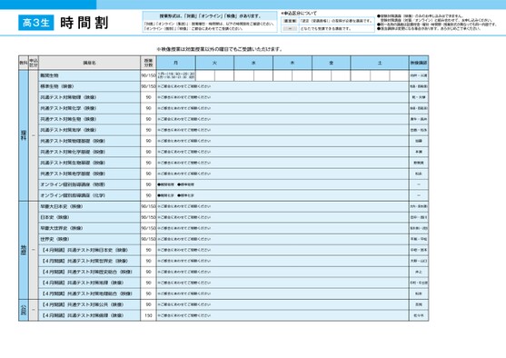 高3生札幌教科申込区分時間割授業形式は、「対面」「オンライン」「映像」があります。「対面」「オンライン(集団)」:授業曜日・時間帯は、以下の時間割をご確認ください。「オンライン(個別)」「映像」:ご都合にあわせてご受講ください。*申込区分について認定制「認定(受講資格)」の取得が必要な講座です。ーどなたでも受講できる講座です。●受験対策講座(映像)のみのお申し込みはできません。受験対策講座(対面/オンライン)と組み合わせて、お申し込みください。●同一名称の講座は設置校舎・曜日・時間帯・授業形式が異なっても同一内容です。●担当講師は変更になる場合があります。あらかじめご了承ください。※映像授業は対面授業以外の曜日でもご受講いただけます。講座名授業分数月火水木金土映像講師向井・三浦牧島・西尾(健)乾・大學安達・西尾(源)唐牛・長井田島・松永加藤本瀬野黒美松永ーー大内・坂本(勝)田中・西川坂本(新)・沼田平尾・平松中垣・宮本大野・山口井上中村・中土居松本吉見佐々木90/1501月〜)18:50〜20:204月〜)18:50〜21:30向井90/150※ご都合にあわせてご視聴ください90909090909090909090※ご都合にあわせてご視聴ください※ご都合にあわせてご視聴ください※ご都合にあわせてご視聴ください※ご都合にあわせてご視聴ください※ご都合にあわせてご視聴ください※ご都合にあわせてご視聴ください※ご都合にあわせてご視聴ください※ご都合にあわせてご視聴ください●難関物理●標準物理●難関化学●標準化学90/150※ご都合にあわせてご視聴ください90/150※ご都合にあわせてご視聴ください90/150※ご都合にあわせてご視聴ください90/150※ご都合にあわせてご視聴ください909090909090※ご都合にあわせてご視聴ください※ご都合にあわせてご視聴ください※ご都合にあわせてご視聴ください※ご都合にあわせてご視聴ください※ご都合にあわせてご視聴ください※ご都合にあわせてご視聴ください難関生物標準生物(映像)共通テスト対策物理(映像)共通テスト対策化学(映像)共通テスト対策生物(映像)共通テスト対策地学(映像)共通テスト対策物理基礎(映像)共通テスト対策化学基礎(映像)共通テスト対策生物基礎(映像)共通テスト対策地学基礎(映像)オンライン個別指導講座(物理)オンライン個別指導講座(化学)早慶大日本史(映像)日本史(映像)早慶大世界史(映像)世界史(映像)-理科-【4月開講】共通テスト対策日本史(映像)地歴【4月開講】共通テスト対策世界史(映像)【4月開講】共通テスト対策歴史総合(映像)【4月開講】共通テスト対策地理(映像)【4月開講】共通テスト対策地理総合(映像)【4月開講】共通テスト対策公共(映像)【4月開講】共通テスト対策倫理(映像)150※ご都合にあわせてご視聴ください-公民5ページ●2026年度/51/北海道/札幌/高3・卒生/パターン4617/2026_51_1_151_11_20250817181006.csv10校了時削除