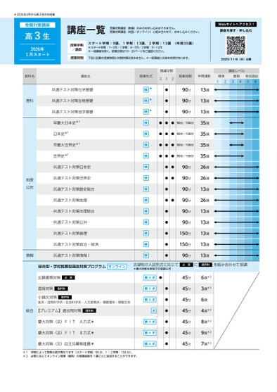 ※2026年4月から高3生の方対象受験対策講座高3生2026年1月スタート講座一覧受験対策講座(映像)のみのお申し込みはできません。受験対策講座(対面/オンライン)と組み合わせて、お申し込みください。Webサイトへアクセス!講座を探す・申し込む授業学期/講数授業時間スタート学期:9講、1学期:13講、2学期:13講〈年間35講〉※スタート学期:1〜3月/1学期:4〜7月/2学期:9〜12月※一部講座を除く。授業日程は19・20ページをご確認ください。下記に記載の授業時間に休憩時間は含みません。※一部講座には途中休憩があります。授業形式開講学期ス12授業時間年間講数標準難関1234特別選抜562025/11/6(木)公開講座レベル教科名講座名共通テスト対策化学基礎理科共通テスト対策生物基礎共通テスト対策地学基礎地歴公民・早慶大日本史※1日本史※1早慶大世界史※1世界史※1共通テスト対策日本史共通テスト対策世界史共通テスト対策歴史総合共通テスト対策地理共通テスト対策地理総合共通テスト対策公共共通テスト対策倫理共通テスト対策政治・経済情報共通テスト対策情報Ⅰ★★★●●●90分90分90分●●●90分/150分●●●90分/150分●●●90分/150分●●●90分/150分●●●●●●●●●●●●90分90分90分90分90分90分150分150分90分13講13講13講35講35講35講35講26講26講13講26講13講13講13講13講13講総合型・学校推薦型選抜対策プログラムオンライン志望校の入試形式に応じて必須に選択制を組み合わせて受講*慶大対策は単独での受講も可出願書類対策必須面接対策選択制小論文対策医系・自然科学系・社会科学系・人文教育系・情報理系・情報文系選択制総合【プレミアム】過去問対策選択制慶大対策(法)FITA方式*慶大対策(法)FITB方式*慶大対策(文)自主応募制推薦*※1学期によって授業分数が異なります(スタート学期:90分、1・2学期:150分)。※2必要に応じてオンライン授業(個別)の受講回数を1講ごとに追加することができます。●●●●●●●45分45分45分45分45分45分45分6講※23講※26講4講※28講※29講※27講※2