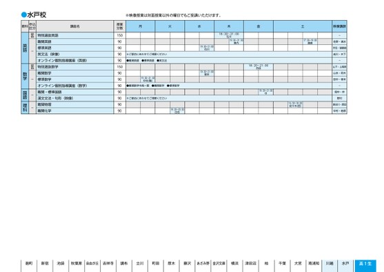 ※映像授業は対面授業以外の曜日でもご受講いただけます。月火水木金土19:30〜21:00石川19:30〜21:00塚本※ご都合にあわせてご視聴ください●難関英語●標準英語●英文法19:30〜21:00中村(隆)●難関数学中高一貫●難関数学●標準数学※ご都合にあわせてご視聴ください19:20〜20:50白石18:20〜21:00石川19:30〜21:00東内17:30〜19:00濱崎18:20〜21:00合田19:30〜21:00中16:30〜18:00佐々木(哲)映像講師-佐野・清水市位・胡摩﨑成川・木下-山下・上高原山本・府木田中・塚本-畑中・仲野村長谷川・原田中村・若原授業分数1509090909015090909090909090特別選抜英語難関英語標準英語英文法(映像)オンライン個別指導講座(英語)特別選抜数学難関数学標準数学オンライン個別指導講座(数学)難関・標準国語漢文文法・句形(映像)難関物理難関化学認定制-認定制---英語数学国語理科水戸●水戸校教科申込区分講座名1ページ●2026年度/51/東日本/水戸/高1生/パターン6617/2026_51_3_344_31_20250817134158.csv校了時削除麹町新宿池袋秋葉原自由が丘吉祥寺調布立川町田厚木藤沢あざみ野金沢文庫横浜津田沼柏千葉大宮南浦和川越水戸高1生