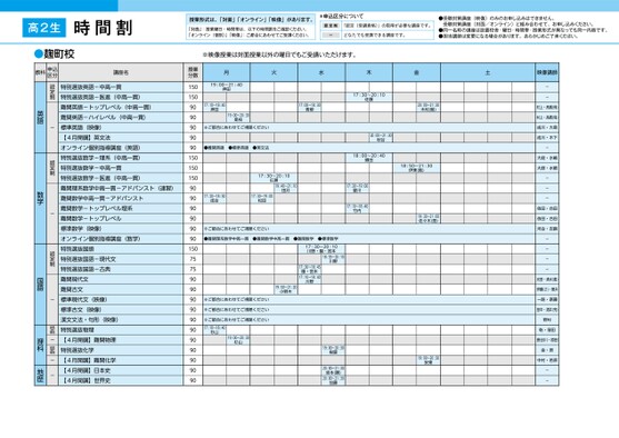 時間割授業形式は、「対面」「オンライン」「映像」があります。「対面」:授業曜日・時間帯は、以下の時間割をご確認ください。「オンライン(個別)」「映像」:ご都合にあわせてご受講ください。*申込区分について認定制「認定(受講資格)」の取得が必要な講座です。ーどなたでも受講できる講座です。●受験対策講座(映像)のみのお申し込みはできません。受験対策講座(対面/オンライン)と組み合わせて、お申し込みください。●同一名称の講座は設置校舎・曜日・時間帯・授業形式が異なっても同一内容です。●担当講師は変更になる場合があります。あらかじめご了承ください。※映像授業は対面授業以外の曜日でもご受講いただけます。月火水木金土19:00〜21:40押田17:10〜18:40押田19:00〜20:30是枝※ご都合にあわせてご視聴ください●難関英語●標準英語●英文法17:00〜18:30青柳17:30〜20:10広瀬19:40〜21:10田井17:20〜18:50成合17:30〜19:00松田※ご都合にあわせてご視聴ください●難関理系数学中高一貫●難関数学中高一貫●難関数学●標準数学17:30〜20:10川野・園・宮本18:55〜20:10川野17:30〜18:45園・宮本17:10〜18:40川野19:50〜21:20小野木※ご都合にあわせてご視聴ください※ご都合にあわせてご視聴ください※ご都合にあわせてご視聴ください17:10〜18:40杉山19:00〜20:30杉山19:00〜20:30樹葉20:00〜21:30坂本(勝)20:00〜21:30加藤17:30〜20:10佐藤20:00〜21:30秋谷18:00〜20:40郷田17:30〜19:00夏川17:10〜18:40竹内20:00〜21:30木村(智)18:50〜21:30伊東(敦)19:30〜21:00佐々木(吾)19:00〜20:30安東師講像映--村上・髙橋(保)村上・髙橋(保)成川・大島成川・木下-大庭・水嶋大庭・水嶋---依田・合田依田・合田河合・吉嗣----光田・清水(直)伊藤(さ)・菅井一路・斎藤田中・酒井(完)野村乾・窪田長谷川・原田金・原中村・若原--授業分数150150909090909015015015090909090909015075759090909090909090909090特別選抜英語-中高一貫特別選抜英語-医進(中高一貫)難関英語-トップレベル(中高一貫)難関英語-ハイレベル(中高一貫)標準英語(映像)【4月開講】英文法オンライン個別指導講座(英語)特別選抜数学-理系(中高一貫)特別選抜数学-中高一貫特別選抜数学-医進(中高一貫)難関理系数学中高一貫-アドバンスト(速習)難関数学中高一貫-アドバンスト難関数学-トップレベル理系難関数学-トップレベル標準数学(映像)オンライン個別指導講座(数学)特別選抜国語特別選抜国語-現代文特別選抜国語-古典難関現代文難関古文標準現代文(映像)標準古文(映像)漢文文法・句形(映像)特別選抜物理【4月開講】難関物理特別選抜化学【4月開講】難関化学【4月開講】日本史【4月開講】世界史認定制-認定制-認定制-認定制-認定制--英語数学国語理科地歴教科申込区分講座名高2生麹町●麹町校1ページ●2026年度/51/東日本/麹町/高2生/パターン6617/2026_51_3_328_32_20250817135901.csv校了時削除