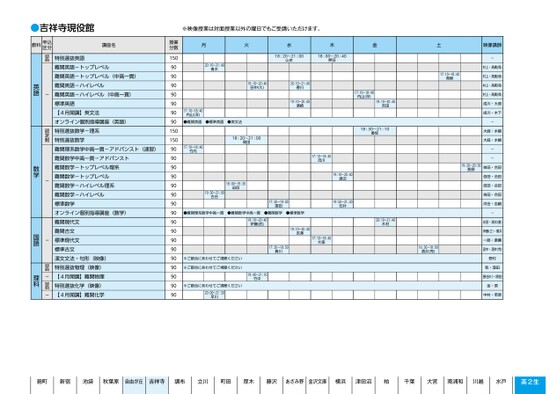 ※映像授業は対面授業以外の曜日でもご受講いただけます。月火水木金土20:10〜21:40青木18:20〜21:00山本18:00〜20:40押田19:10〜20:40田中(久)20:10〜21:40香川19:10〜20:40濱崎17:10〜18:40内山(洋)●難関英語●標準英語●英文法17:10〜18:40内山(洋)19:10〜20:40吉田18:30〜21:10香坂17:10〜18:40青柳19:20〜20:50長野師講像映-村上・髙橋(保)村上・髙橋(保)村上・髙橋(保)村上・髙橋(保)成川・大島成川・木下-大庭・水嶋大庭・水嶋--依田・合田依田・合田依田・合田依田・合田河合・吉嗣-光田・清水(直)伊藤(さ)・菅井一路・斎藤田中・酒井(完)野村乾・窪田長谷川・原田金・原中村・若原18:20〜21:00岡田17:10〜18:40竹内18:00〜19:30迫田19:30〜21:00古谷●難関理系数学中高一貫●難関数学中高一貫19:10〜20:40伊藤(武)19:40〜21:10竹中※ご都合にあわせてご視聴ください※ご都合にあわせてご視聴ください※ご都合にあわせてご視聴ください20:00〜21:30早川17:20〜18:50貴川17:30〜19:00窪田●難関数学●標準数学19:10〜20:40吉澤17:10〜18:40流川19:10〜20:40渡辺19:50〜21:20石井17:10〜18:40大窪20:10〜21:40木村16:30〜18:00酒井(完)授業分数150909090909090901501509090909090909090909090909090909090講座名特別選抜英語難関英語-トップレベル難関英語-トップレベル(中高一貫)難関英語-ハイレベル難関英語-ハイレベル(中高一貫)標準英語【4月開講】英文法オンライン個別指導講座(英語)特別選抜数学-理系特別選抜数学難関理系数学中高一貫-アドバンスト(速習)難関数学中高一貫-アドバンスト難関数学-トップレベル理系難関数学-トップレベル難関数学-ハイレベル理系難関数学-ハイレベル標準数学オンライン個別指導講座(数学)難関現代文難関古文標準現代文標準古文漢文文法・句形(映像)特別選抜物理(映像)【4月開講】難関物理特別選抜化学(映像)【4月開講】難関化学認定制教科申込区分-英語認定制--認定制-認定制-数学国語理科吉祥寺●吉祥寺現役館1ページ●2026年度/51/東日本/吉祥寺/高2生/パターン6617/2026_51_3_340_32_20250817135901.csv校了時削除麹町新宿池袋秋葉原自由が丘吉祥寺調布立川町田厚木藤沢あざみ野金沢文庫横浜津田沼柏千葉大宮南浦和川越水戸高2生