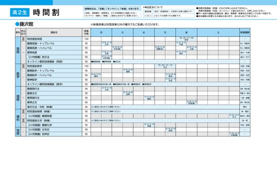 時間割授業形式は、「対面」「オンライン」「映像」があります。「対面」:授業曜日・時間帯は、以下の時間割をご確認ください。「オンライン(個別)」「映像」:ご都合にあわせてご受講ください。*申込区分について認定制「認定(受講資格)」の取得が必要な講座です。ーどなたでも受講できる講座です。●受験対策講座(映像)のみのお申し込みはできません。受験対策講座(対面/オンライン)と組み合わせて、お申し込みください。●同一名称の講座は設置校舎・曜日・時間帯・授業形式が異なっても同一内容です。●担当講師は変更になる場合があります。あらかじめご了承ください。※映像授業は対面授業以外の曜日でもご受講いただけます。月火水木金土18:20〜21:00伊吹18:20〜19:50中島18:10〜19:40岡本20:00〜21:30大胡20:00〜21:30阿部(順)18:30〜20:00木村(智)18:00〜19:30伊藤(宏)20:00〜21:30山中19:40〜21:10大島20:10〜21:40木村(智)18:30〜21:10川口19:10〜20:4020:00〜21:30板谷合田●難関英語●標準英語●英文法18:00〜19:30富田●難関理系数学中高一貫20:10〜21:40小池19:20〜20:50堀尾●難関数学中高一貫●難関数学●標準数学19:10〜20:40吉澤19:10〜20:40飯田※ご都合にあわせてご視聴ください※ご都合にあわせてご視聴ください※ご都合にあわせてご視聴ください20:10〜21:40安達20:10〜21:40依田映像講師-村上・髙橋(保)村上・髙橋(保)成川・大島成川・木下-大庭・水嶋依田・合田依田・合田河合・吉嗣-光田・清水(直)伊藤(さ)・菅井一路・斎藤田中・酒井(完)野村乾・窪田長谷川・原田金・原中村・若原--19:00〜20:30井上19:00〜20:30平尾(雅)授業分数1509090909090150909090909090909090909090909090特別選抜英語難関英語-トップレベル難関英語-ハイレベル標準英語【4月開講】英文法オンライン個別指導講座(英語)特別選抜数学難関数学-トップレベル難関数学-ハイレベル標準数学オンライン個別指導講座(数学)難関現代文難関古文標準現代文標準古文漢文文法・句形(映像)特別選抜物理(映像)【4月開講】難関物理特別選抜化学(映像)【4月開講】難関化学【4月開講】日本史【4月開講】世界史認定制-認定制--認定制-認定制--英語数学国語理科地歴教科申込区分講座名高2生藤沢●藤沢館1ページ●2026年度/51/東日本/藤沢/高2生/パターン6617/2026_51_3_331_32_20250817084720.csv校了時削除