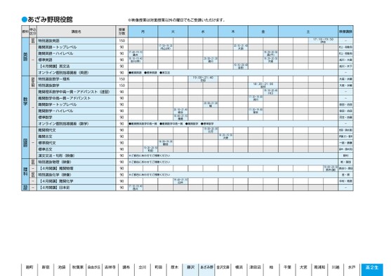 映像講師-村上・髙橋(保)村上・髙橋(保)成川・大島成川・木下-大庭・水嶋大庭・水嶋--依田・合田依田・合田河合・吉嗣-光田・清水(直)伊藤(さ)・菅井一路・斎藤田中・酒井(完)野村乾・窪田長谷川・原田金・原中村・若原-20:10〜21:40板谷19:40〜21:10福島●難関数学中高一貫●難関理系数学中高一貫●難関数学●標準数学19:00〜20:30三河18:20〜19:50大野19:40〜21:10臼井19:00〜20:30鈴木(誠)※映像授業は対面授業以外の曜日でもご受講いただけます。月火水木金土20:10〜21:40大胡19:10〜20:40吉田20:00〜21:30清川19:00〜21:40合田20:00〜21:30隣17:10〜19:50伊吹19:20〜20:50森(千)19:20〜20:50大島18:20〜21:00岩村19:10〜20:40川口17:30〜19:00流川17:30〜19:00塚本17:50〜19:20内山(洋)17:40〜19:10鏑木18:10〜19:40吉川(幸)●難関英語●標準英語●英文法18:00〜19:30飯田19:20〜20:50和田※ご都合にあわせてご視聴ください※ご都合にあわせてご視聴ください※ご都合にあわせてご視聴ください17:10〜18:40西川授業分数150909090909015015090909090909090909090909090909090特別選抜英語難関英語-トップレベル難関英語-ハイレベル標準英語【4月開講】英文法オンライン個別指導講座(英語)特別選抜数学-理系特別選抜数学難関理系数学中高一貫-アドバンスト(速習)難関数学中高一貫-アドバンスト難関数学-トップレベル難関数学-ハイレベル標準数学オンライン個別指導講座(数学)難関現代文難関古文標準現代文標準古文漢文文法・句形(映像)特別選抜物理(映像)【4月開講】難関物理特別選抜化学(映像)【4月開講】難関化学【4月開講】日本史認定制-認定制--認定制-認定制--英語数学国語理科地歴あざみ野●あざみ野現役館教科申込区分講座名1ページ●2026年度/51/東日本/あざみ野/高2生/パターン6617/2026_51_3_339_32_20250817084720.csv校了時削除麹町新宿池袋秋葉原自由が丘吉祥寺調布立川町田厚木藤沢あざみ野金沢文庫横浜津田沼柏千葉大宮南浦和川越水戸高2生