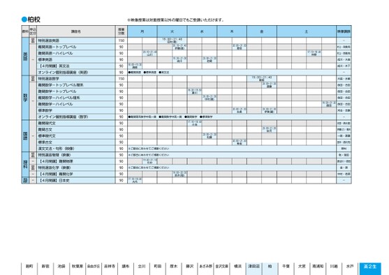※映像授業は対面授業以外の曜日でもご受講いただけます。月火水木金土19:00〜21:40田村(喜)20:10〜21:40伊藤(直)20:10〜21:40山川18:00〜19:30濱崎●難関英語●標準英語●英文法19:30〜21:00成川20:00〜21:30岩間18:20〜19:50夏川20:00〜21:30中村(隆)20:00〜21:30是枝17:10〜18:40仲野19:00〜21:40飯島20:00〜21:30遠藤20:00〜21:30永島20:00〜21:30伊東(鋼)20:00〜21:30佐河20:00〜21:30隼坂●難関理系数学中高一貫●難関数学中高一貫●難関数学●標準数学17:10〜18:40小池20:00〜21:30松藤※ご都合にあわせてご視聴ください※ご都合にあわせてご視聴ください19:40〜21:10竹中※ご都合にあわせてご視聴ください17:10〜18:40大内19:00〜20:30鈴木(翔)19:50〜21:20島田師講像映-村上・髙橋(保)村上・髙橋(保)成川・大島成川・木下-大庭・水嶋依田・合田依田・合田依田・合田依田・合田河合・吉嗣-光田・清水(直)伊藤(さ)・菅井一路・斎藤田中・酒井(完)野村乾・窪田長谷川・原田金・原中村・若原-講座名特別選抜英語難関英語-トップレベル難関英語-ハイレベル標準英語【4月開講】英文法オンライン個別指導講座(英語)特別選抜数学難関数学-トップレベル理系難関数学-トップレベル難関数学-ハイレベル理系難関数学-ハイレベル標準数学オンライン個別指導講座(数学)難関現代文難関古文標準現代文標準古文漢文文法・句形(映像)特別選抜物理(映像)【4月開講】難関物理特別選抜化学(映像)【4月開講】難関化学【4月開講】日本史授業分数150909090909015090909090909090909090909090909090認定制-認定制--認定制-認定制--英語数学国語理科地歴●柏校柏教科申込区分1ページ●2026年度/51/東日本/柏/高2生/パターン6617/2026_51_3_322_32_20250817135901.csv校了時削除麹町新宿池袋秋葉原自由が丘吉祥寺調布立川町田厚木藤沢あざみ野金沢文庫横浜津田沼柏千葉大宮南浦和川越水戸高2生