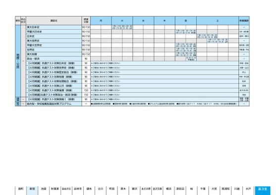 時間割授業形式は、「対面」「オンライン」「映像」があります。「対面」「オンライン(集団)」:授業曜日・時間帯は、以下の時間割をご確認ください。「オンライン(個別)」「映像」:ご都合にあわせてご受講ください。*申込区分について認定制「認定(受講資格)」の取得が必要な講座です。ーどなたでも受講できる講座です。●受験対策講座(映像)のみのお申し込みはできません。受験対策講座(対面/オンライン)と組み合わせて、お申し込みください。●同一名称の講座は設置校舎・曜日・時間帯・授業形式が異なっても同一内容です。●担当講師は変更になる場合があります。あらかじめご了承ください。※映像授業は対面授業以外の曜日でもご受講いただけます。月火水木金土17:30〜20:10西田19:20〜20:50東内17:30〜20:10丹羽1月〜)18:40〜20:104月〜)17:30〜20:10早川1月〜)18:10〜19:404月〜)17:00〜19:40村上19:20〜20:50小林17:20〜18:50高橋(勝)17:20〜18:50小林※ご都合にあわせてご視聴ください17:20〜18:50高山17:20〜18:50幸長17:30〜20:10桜井19:20〜20:50岩間17:20〜18:50矢作1月〜)18:00〜19:304月〜)16:50〜19:30矢作15:00〜16:30矢作●難関国公立大英語●国公立大英語●私大英語●入試頻出英文法・語法17:30〜20:10須藤17:10〜18:40生田17:20〜18:50刈谷19:20〜20:50須藤18:00〜19:30飯田17:20〜18:50柳沢17:00〜19:40秦野17:30〜20:10刈谷17:20〜18:50尾台17:20〜18:50永島17:20〜18:50平野※ご都合にあわせてご視聴ください※ご都合にあわせてご視聴ください※ご都合にあわせてご視聴ください●数列(難関/標準)●微分・積分(難関/標準)●ベクトル(難関/標準)●確率(難関/標準)17:10〜19:50刈谷17:00〜18:30柳沢●難関数学ⅠAⅡBC●標準理系数学ⅢC●標準数学ⅠAⅡBC●難関理系数学ⅢC17:20〜20:40三河・園・西川19:10〜20:40三河17:20〜18:50園・西川90/150906090/1501月〜)17:20〜18:504月〜)17:20〜20:10小野木・西川17:20〜18:50小野木※ご都合にあわせてご視聴ください1月〜)19:00〜20:304月〜)19:00〜21:40木村19:20〜20:50松藤1月〜)18:50〜20:204月〜)18:50〜21:30兵頭師講像映ーー佐野・胡摩﨑柴田(卓)・髙橋(慶)安井・近藤ー吉川(量)・大島小林柴田(祐)・守屋ーーー樋原・須藤秦野・堀尾秦野・堀尾依田・山本樋原・宮田高梨(大)・波平秦野・永島森本・清水森本・清水湘田ーーーーー井上・佐藤山村・坂下藤川・西川山村・坂下藤川・西川一瀬・菱山授業分数1501509090/1509090909090901501501509090909090909090909090180909090東大英語特別選抜英語-国公立大難関国公立大英語早慶大英語国公立大英語GMARCH英語私大英語入試頻出英文法・語法【4月開講】共通テスト対策英語(映像)オンライン個別指導講座(英語)東大理類数学東大文類数学特別選抜理系数学ⅢC特別選抜数学ⅠAⅡBC-理系特別選抜数学ⅠAⅡBC-文系難関理系数学ⅢC難関数学ⅠAⅡBC標準理系数学ⅢC標準数学ⅠAⅡBC共通テスト対策数学ⅠAⅡBC(映像)共通テスト対策数学ⅠA(映像)共通テスト対策数学C「平面上の曲線と複素数平面」映像)数学重要テーマ対策ユニット(映像)オンライン個別指導講座(数学)東大国語東大現代文東大古典難関現代文-二次・私大対応難関古典-二次・私大対応難関古文-二次・私大対応【4月開講】難関漢文(映像)早大現代文認定制-認定制-認定制-英語数学国語教科申込区分講座名高3生池袋●池袋校1ページ●2026年度/51/東日本/池袋/高3・卒生/パターン6617/2026_51_3_314_11_20250817185653.csv校了時削除