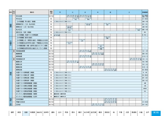 高3生時間割授業形式は、「対面」「オンライン」「映像」があります。「対面」「オンライン(集団)」:授業曜日・時間帯は、以下の時間割をご確認ください。「オンライン(個別)」「映像」:ご都合にあわせてご受講ください。*申込区分について認定制「認定(受講資格)」の取得が必要な講座です。ーどなたでも受講できる講座です。●受験対策講座(映像)のみのお申し込みはできません。受験対策講座(対面/オンライン)と組み合わせて、お申し込みください。●同一名称の講座は設置校舎・曜日・時間帯・授業形式が異なっても同一内容です。●担当講師は変更になる場合があります。あらかじめご了承ください。池袋●池袋校※映像授業は対面授業以外の曜日でもご受講いただけます。月火水木金土1月〜)18:10〜19:404月〜)17:00〜19:40加藤19:20〜20:50佐々木(洋)1月〜)19:10〜20:404月〜)18:00〜20:40山口1月〜)19:10〜20:404月〜)18:00〜20:40沼田20:00〜21:30中村※ご都合にあわせてご視聴ください※ご都合にあわせてご視聴ください※ご都合にあわせてご視聴ください※ご都合にあわせてご視聴ください※ご都合にあわせてご視聴ください※ご都合にあわせてご視聴ください※ご都合にあわせてご視聴ください※ご都合にあわせてご視聴ください※ご都合にあわせてご視聴ください映像講師ー坂本(新)・沼田平尾(雅)・平松ーー中垣・宮本大野・山口井上中村・中土居松本吉見佐々木(洋)河合加賀・佐藤竹内・山家小野●出願書類対策(必須受講)●面接対策(選択制)●小論文対策(選択制)●【プレミアム】過去問対策(選択制)●慶大対策<(法)FITA方式/(法)FITB方式/(文)自主応募制推薦>ー授業分数90/15090/15090/150909090909090909015015090ー世界史論述早慶大世界史世界史地理政治・経済【4月開講】共通テスト対策日本史(映像)【4月開講】共通テスト対策世界史(映像)【4月開講】共通テスト対策歴史総合(映像)【4月開講】共通テスト対策地理(映像)【4月開講】共通テスト対策地理総合(映像)【4月開講】共通テスト対策公共(映像)【4月開講】共通テスト対策倫理(映像)【4月開講】共通テスト対策政治・経済(映像)【4月開講】共通テスト対策情報Ⅰ(映像)総合型・学校推薦型選抜対策プログラム-地歴・公民--情報総合教科申込区分講座名5ページ●2026年度/51/東日本/池袋/高3・卒生/パターン6617/2026_51_3_314_11_20250817185653.csv校了時削除